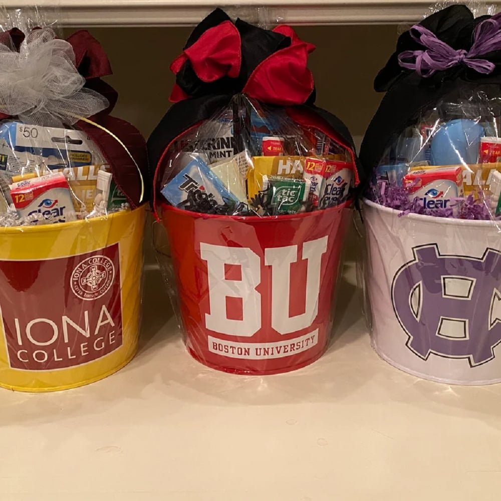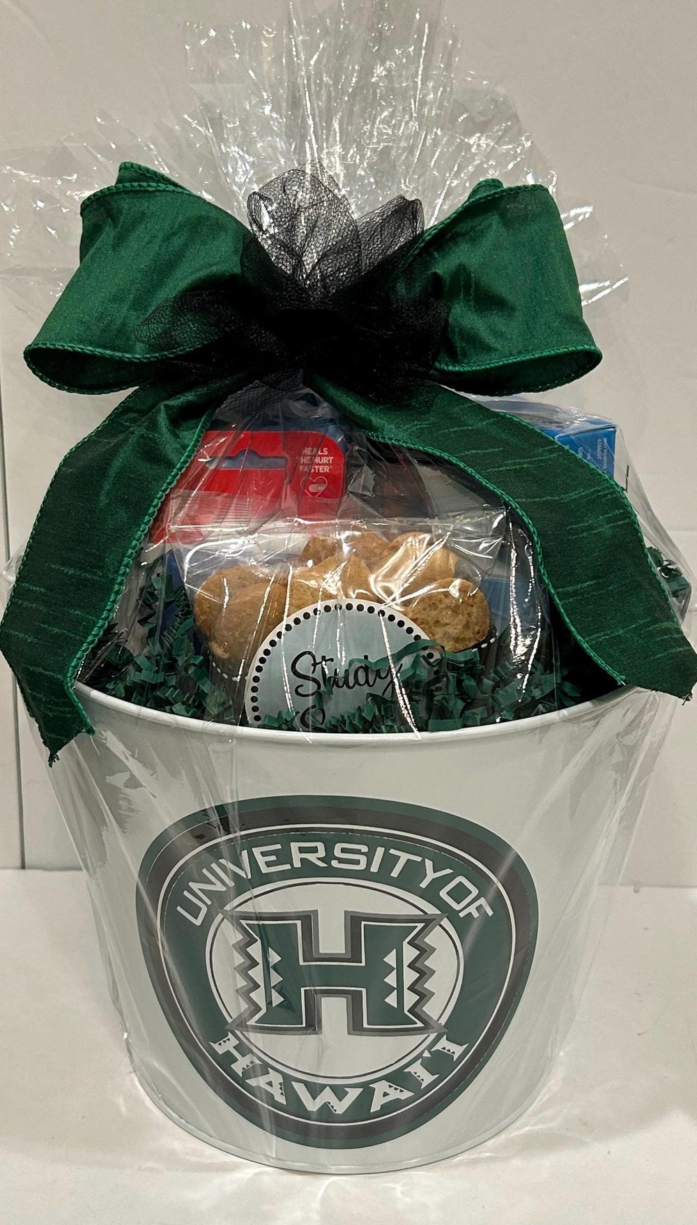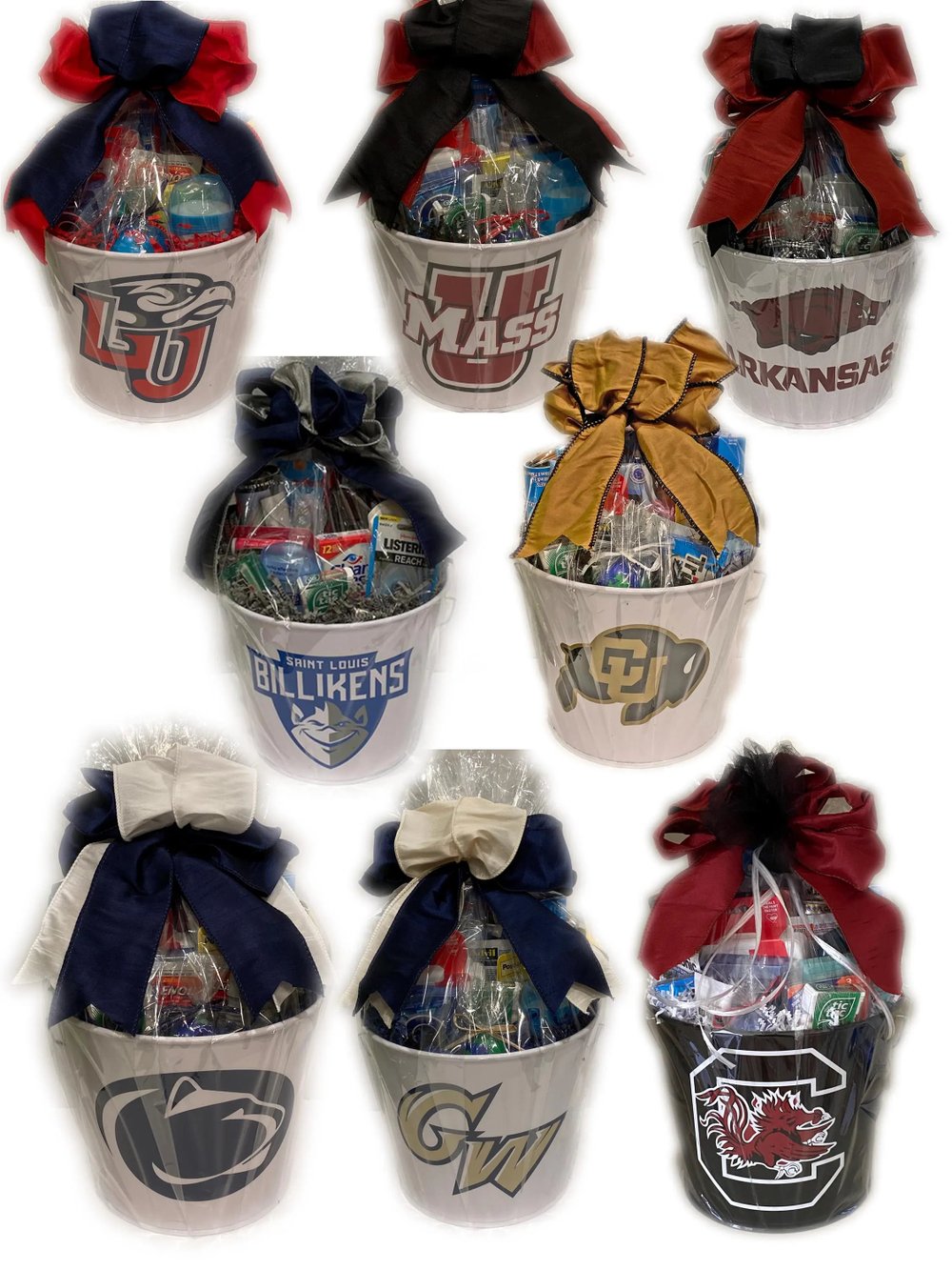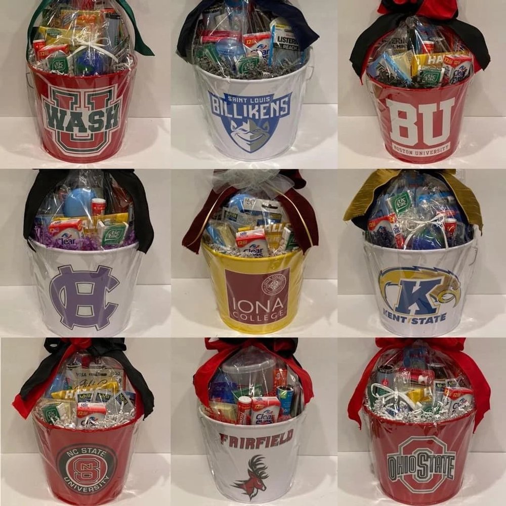 Chaque panier est entièrement personnalisé pour correspondre à la nouvelle université du diplômé, avec le logo et les couleurs de l'école sur le seau, accompagné d'un ruban assorti. La conception vibrante, sur le thème de l'école, montre instantanément leur nouvelle fierté et fait en sorte que le cadeau soit uniquement le leur.