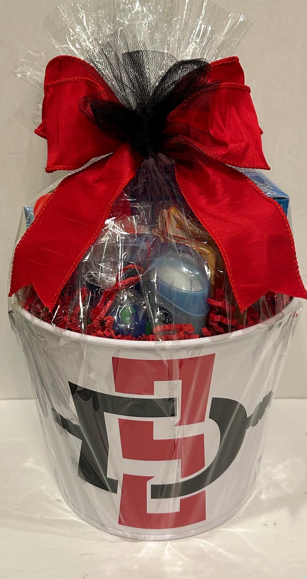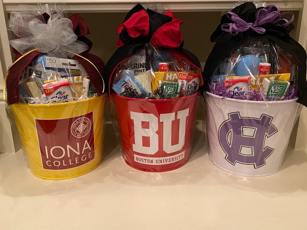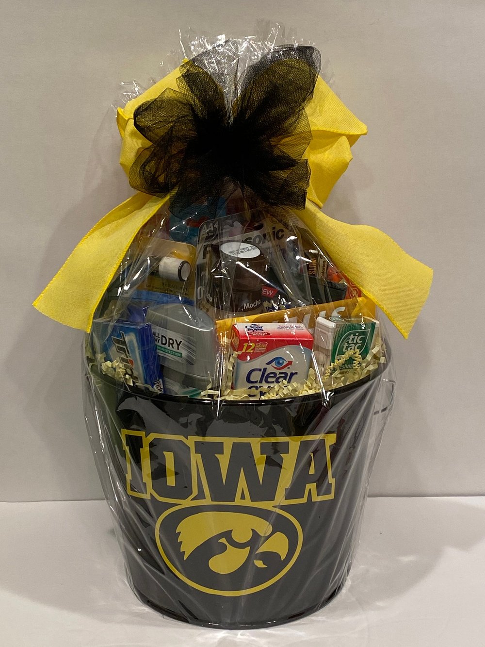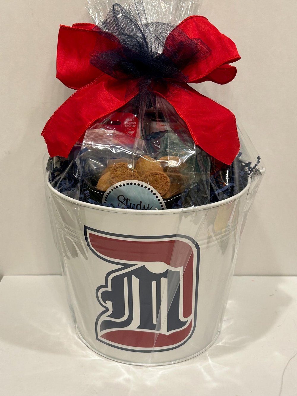 Chaque panier est entièrement personnalisé pour correspondre à la nouvelle université du diplômé, avec le logo et les couleurs de l'école sur le seau, accompagné d'un ruban assorti. La conception vibrante, sur le thème de l'école, montre instantanément leur nouvelle fierté et fait en sorte que le cadeau soit uniquement le leur.