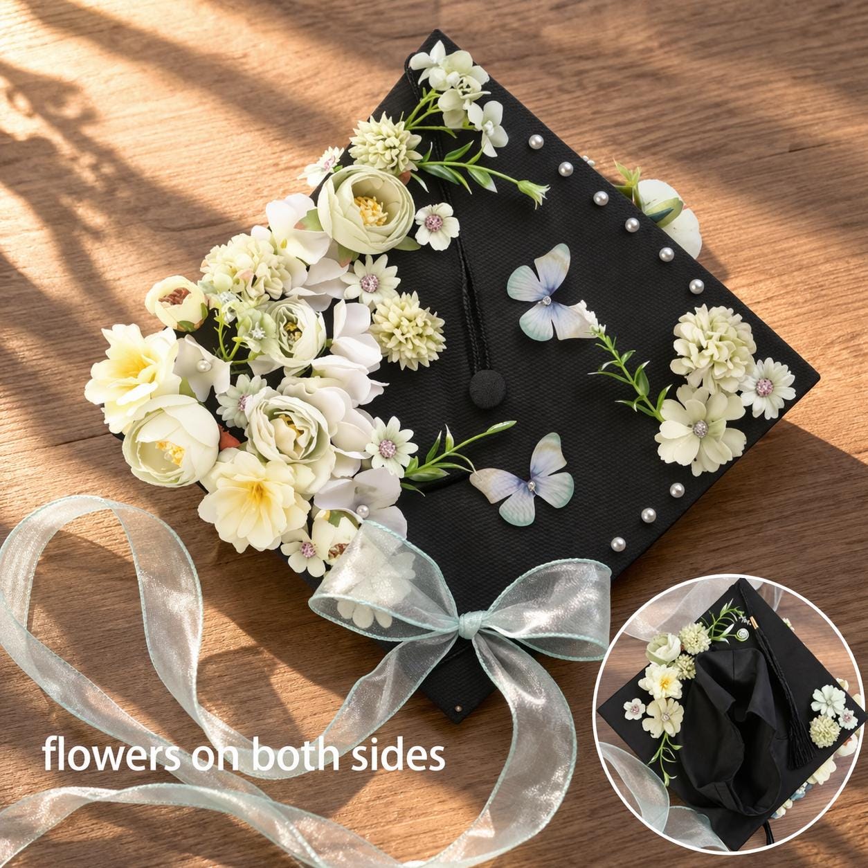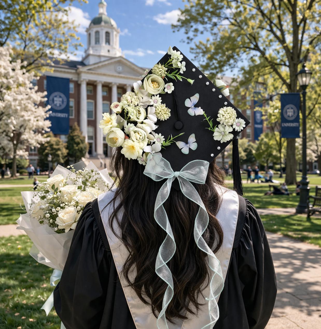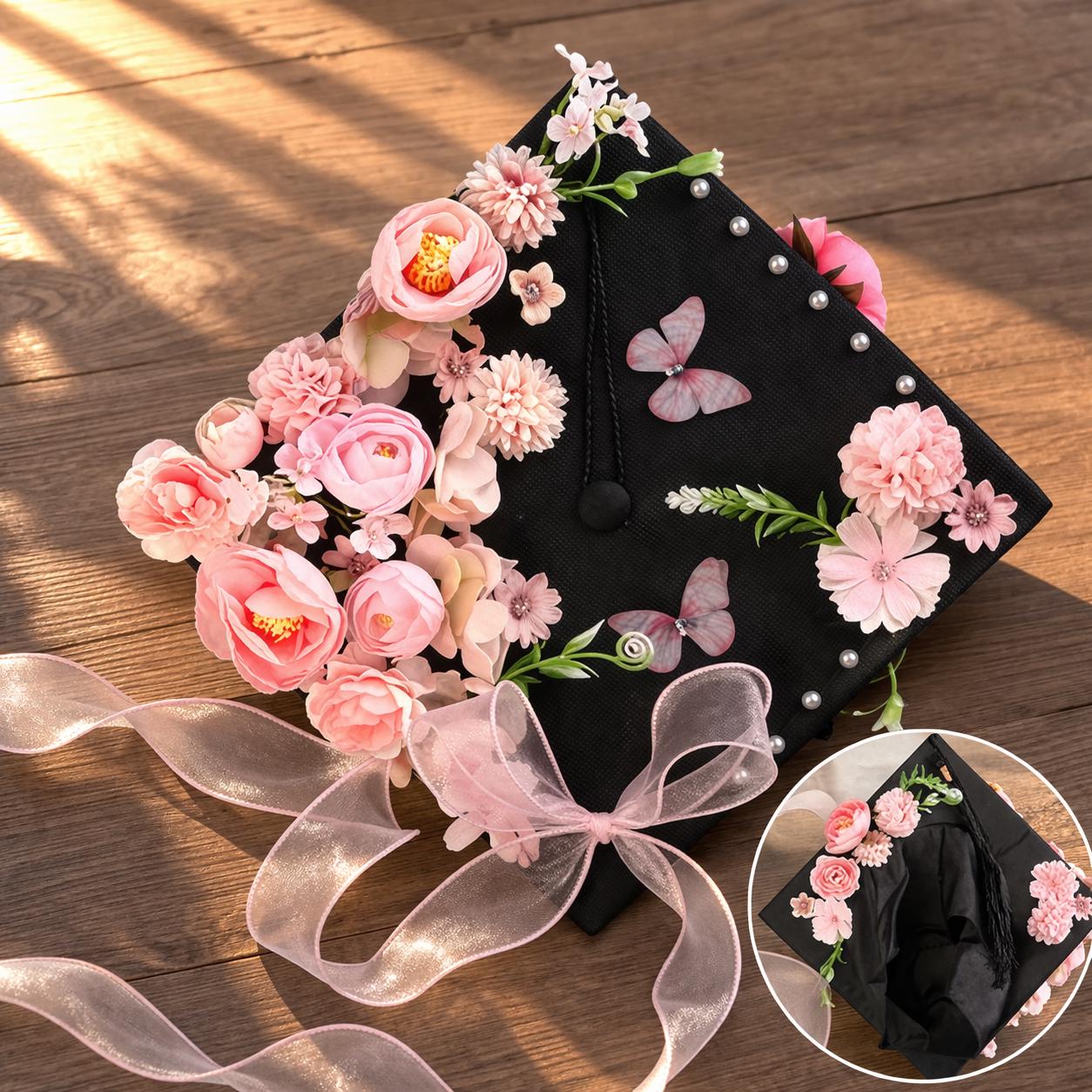 Conçu pour rehausser chaque moment de la remise des diplômes, ce papillon floral s'attache sans problème à n'importe quel chapeau de fin d'études standard. Il fera tourner les têtes lors des cérémonies de remise des diplômes, des séances de photos de fin d'études, des fêtes de fin d'études et des célébrations de fin d'études. Son design doux et féminin vous permet d'être au centre de l'attention, de capturer des souvenirs inoubliables sur fond de campus emblématique et d'en faire un souvenir décoratif à exposer longtemps après le jour de la remise des diplômes.