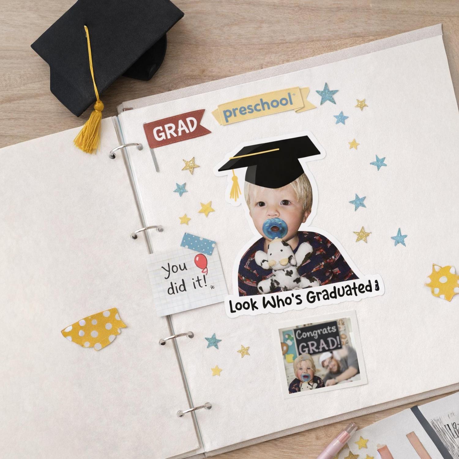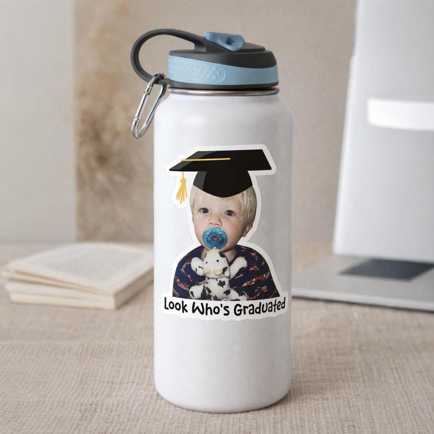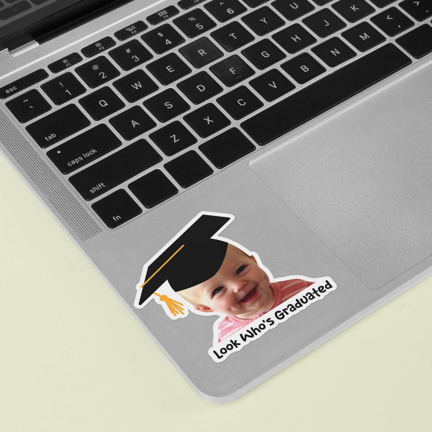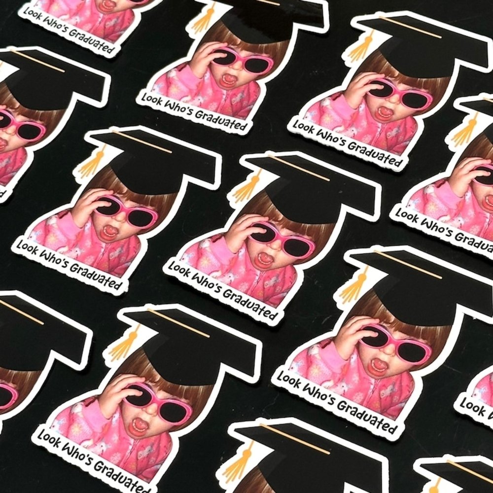 Imprimé sur un vinyle durable et imperméable, résistant aux rayures et facile à décoller. Chaque autocollant est découpé à l'emporte-pièce ou personnalisé pour mettre en valeur la photo et le texte de votre diplômé, ce qui lui confère un aspect professionnel et soigné.