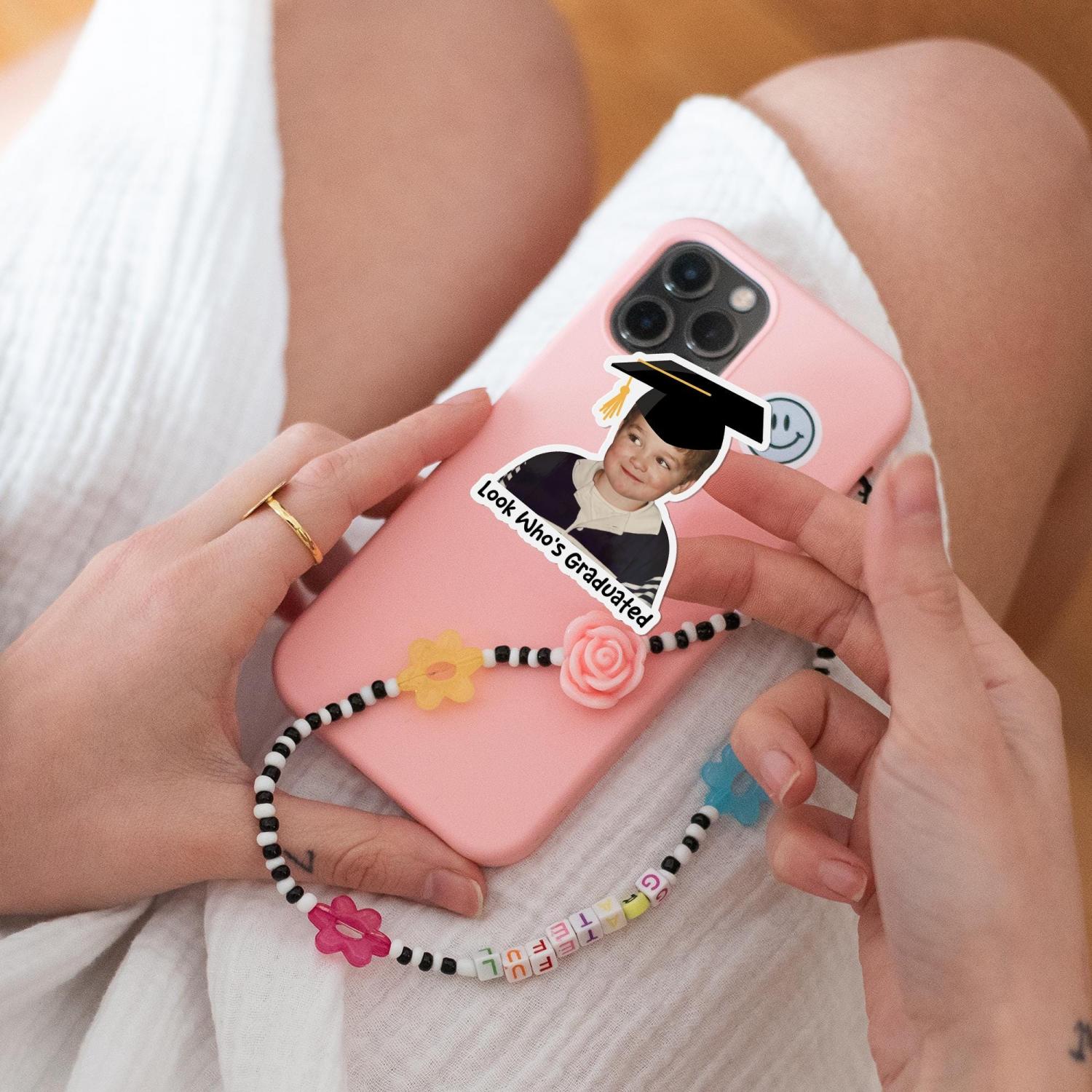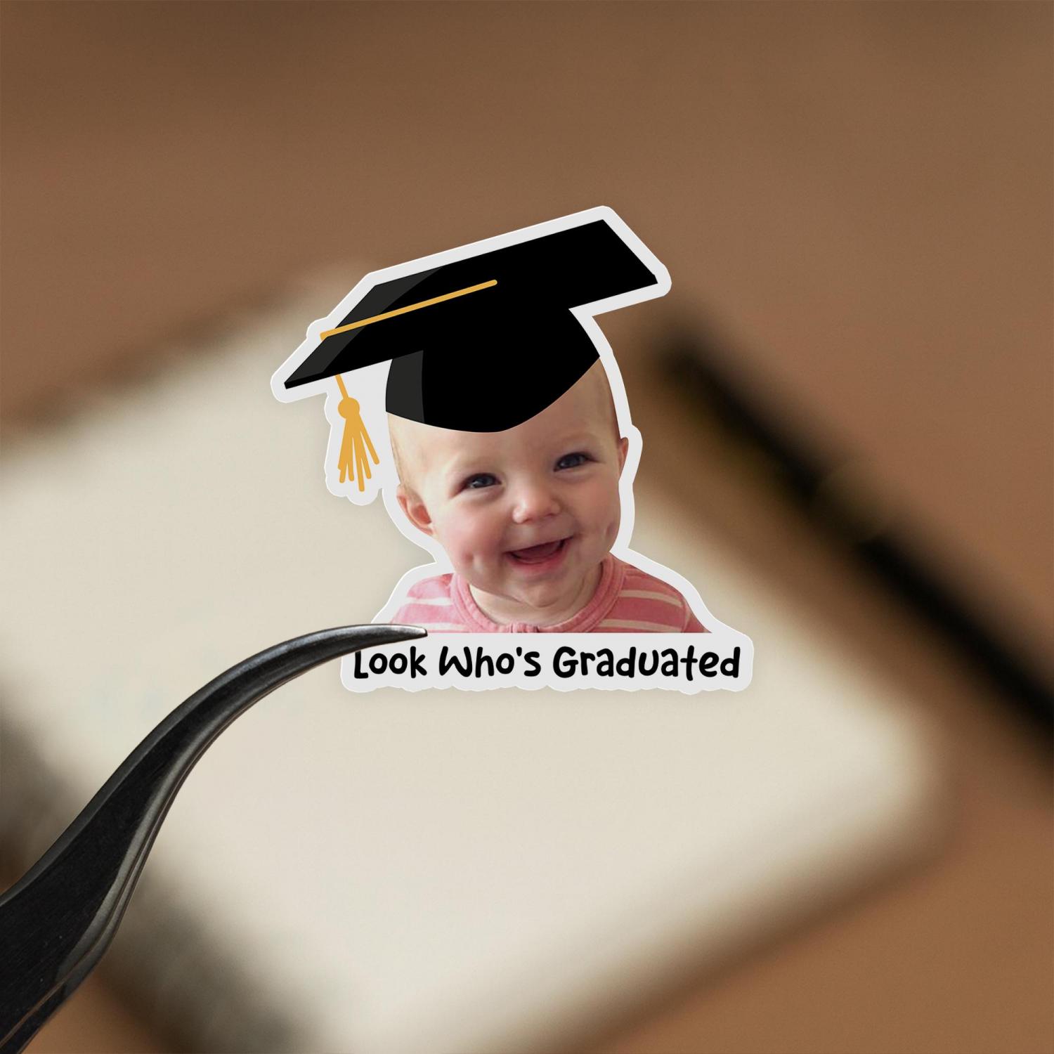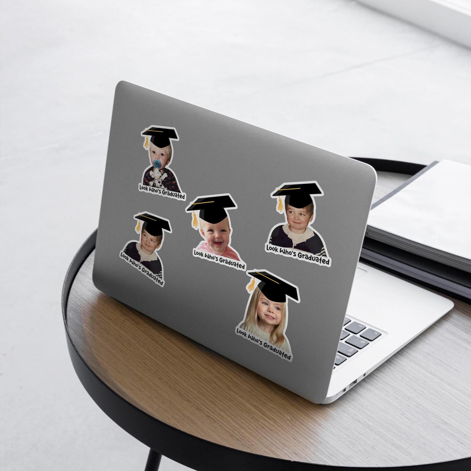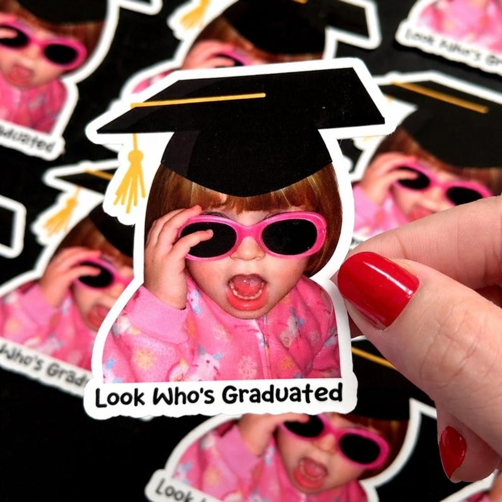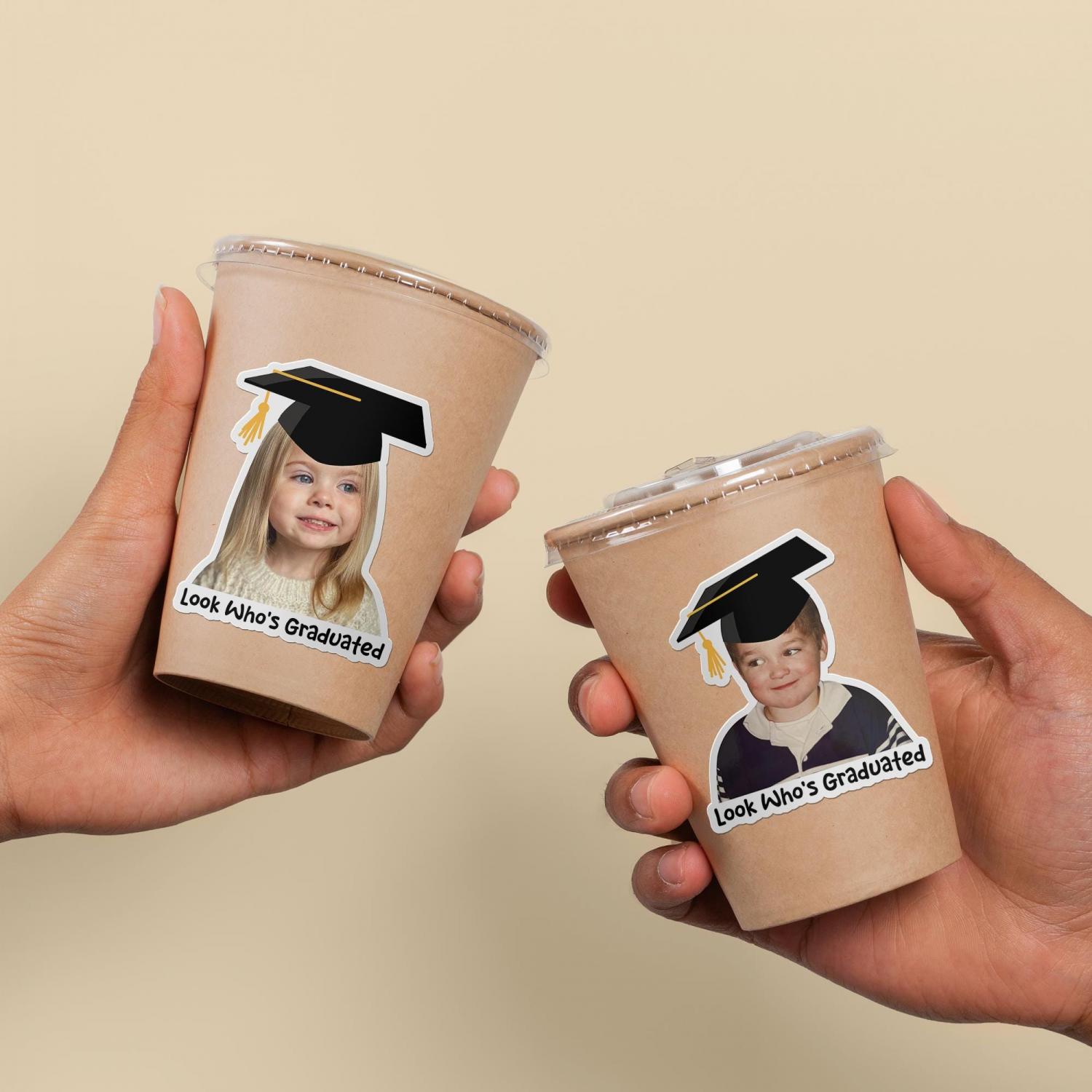 Imprimé sur un vinyle durable et imperméable, résistant aux rayures et facile à décoller. Chaque autocollant est découpé à l'emporte-pièce ou personnalisé pour mettre en valeur la photo et le texte de votre diplômé, ce qui lui confère un aspect professionnel et soigné.