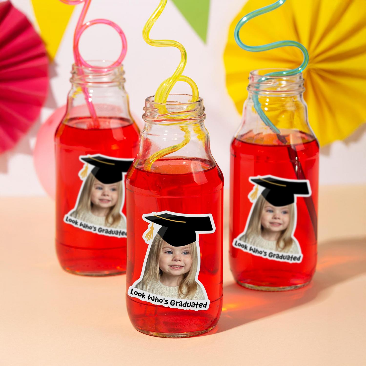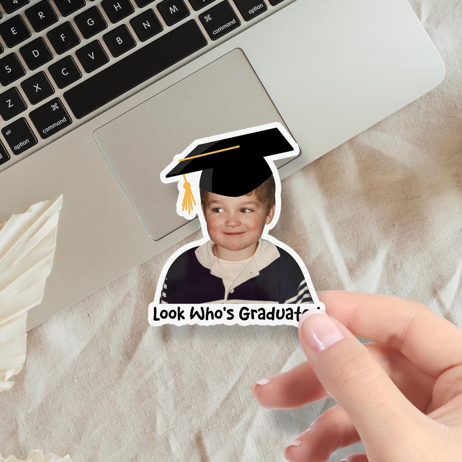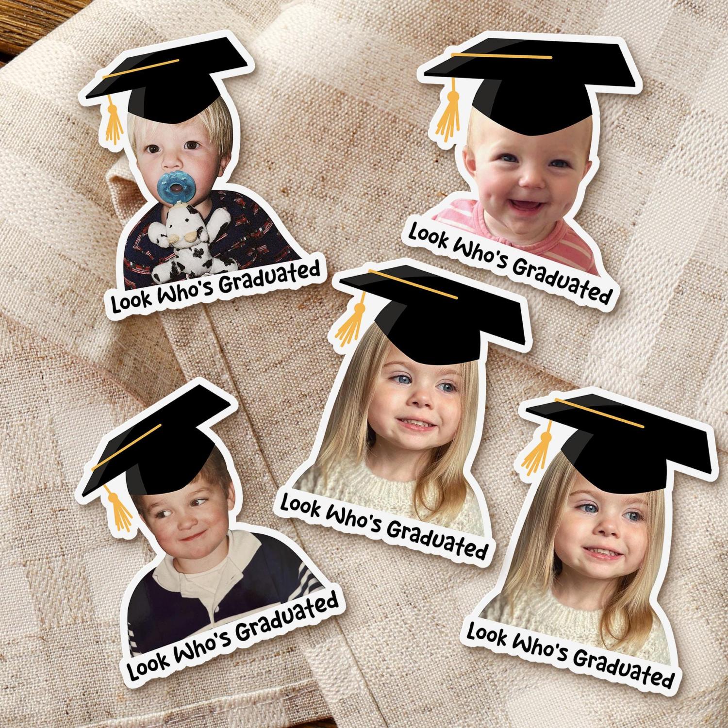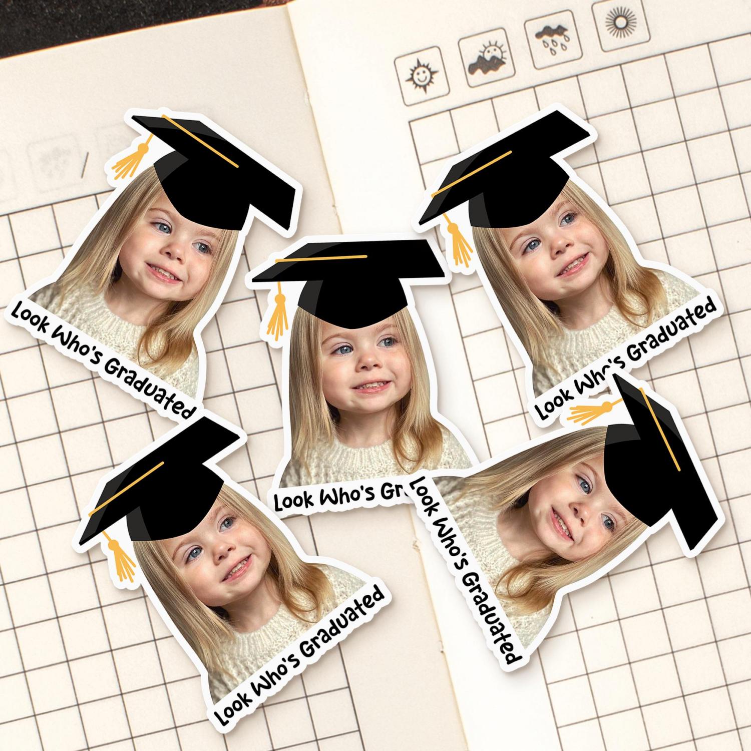 Imprimé sur un vinyle durable et imperméable, résistant aux rayures et facile à décoller. Chaque autocollant est découpé à l'emporte-pièce ou personnalisé pour mettre en valeur la photo et le texte de votre diplômé, ce qui lui confère un aspect professionnel et soigné.