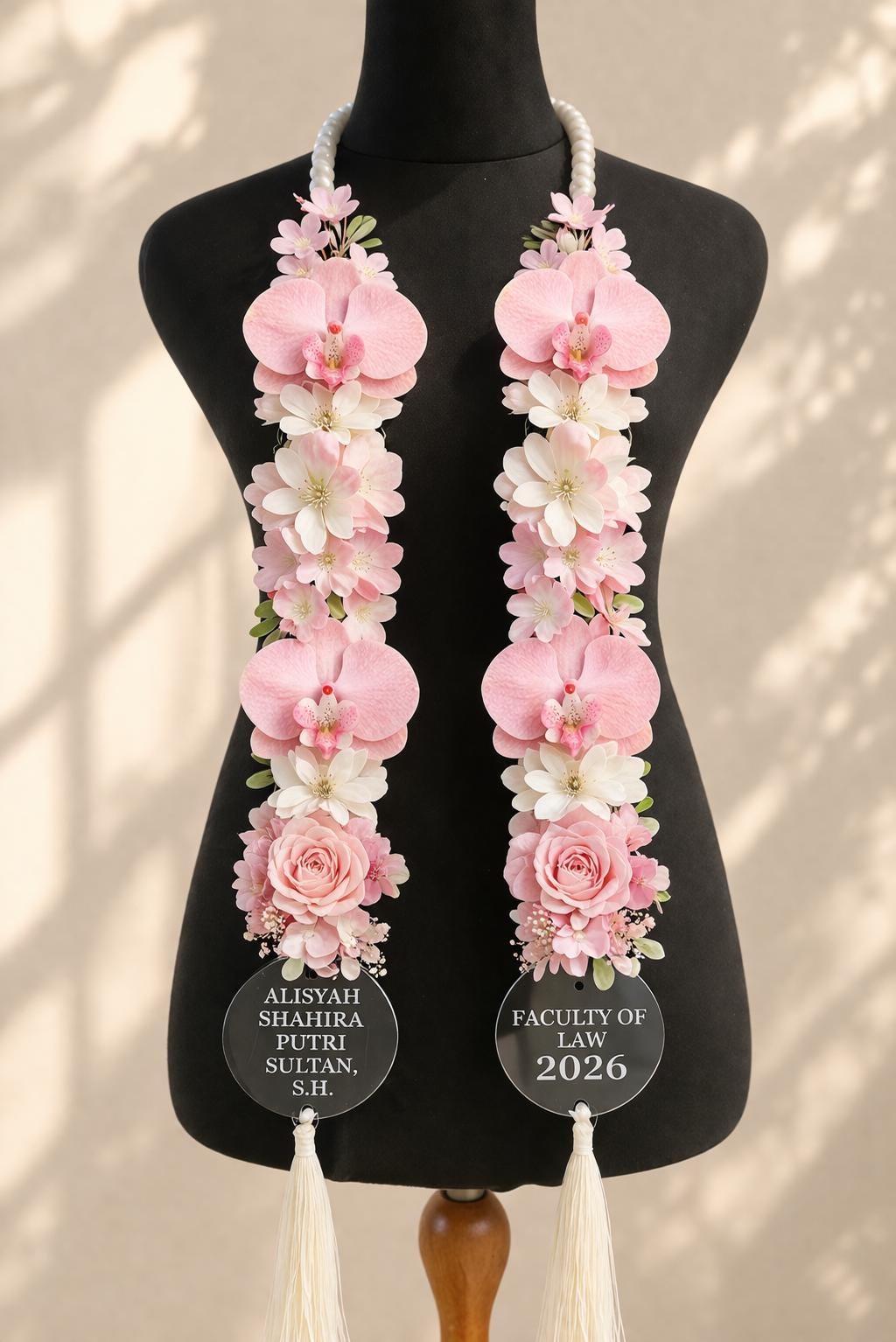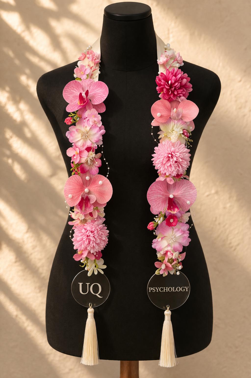 Réalisée à la main avec une attention méticuleuse aux détails, cette étole de fin d'études est ornée d'une sélection de fleurs artificielles réalistes de haute qualité, dans des tons roses pastel, associées à de délicates perles flottantes qui ajoutent un éclat subtil et luxueux. Le design est complété par un ruban de satin lisse et d'élégantes pampilles, créant ainsi une étole légère et confortable qui se drape magnifiquement sur n'importe quelle robe de fin d'études, conservant sa couleur vibrante et sa forme au fil des cérémonies, des photos et des célébrations.