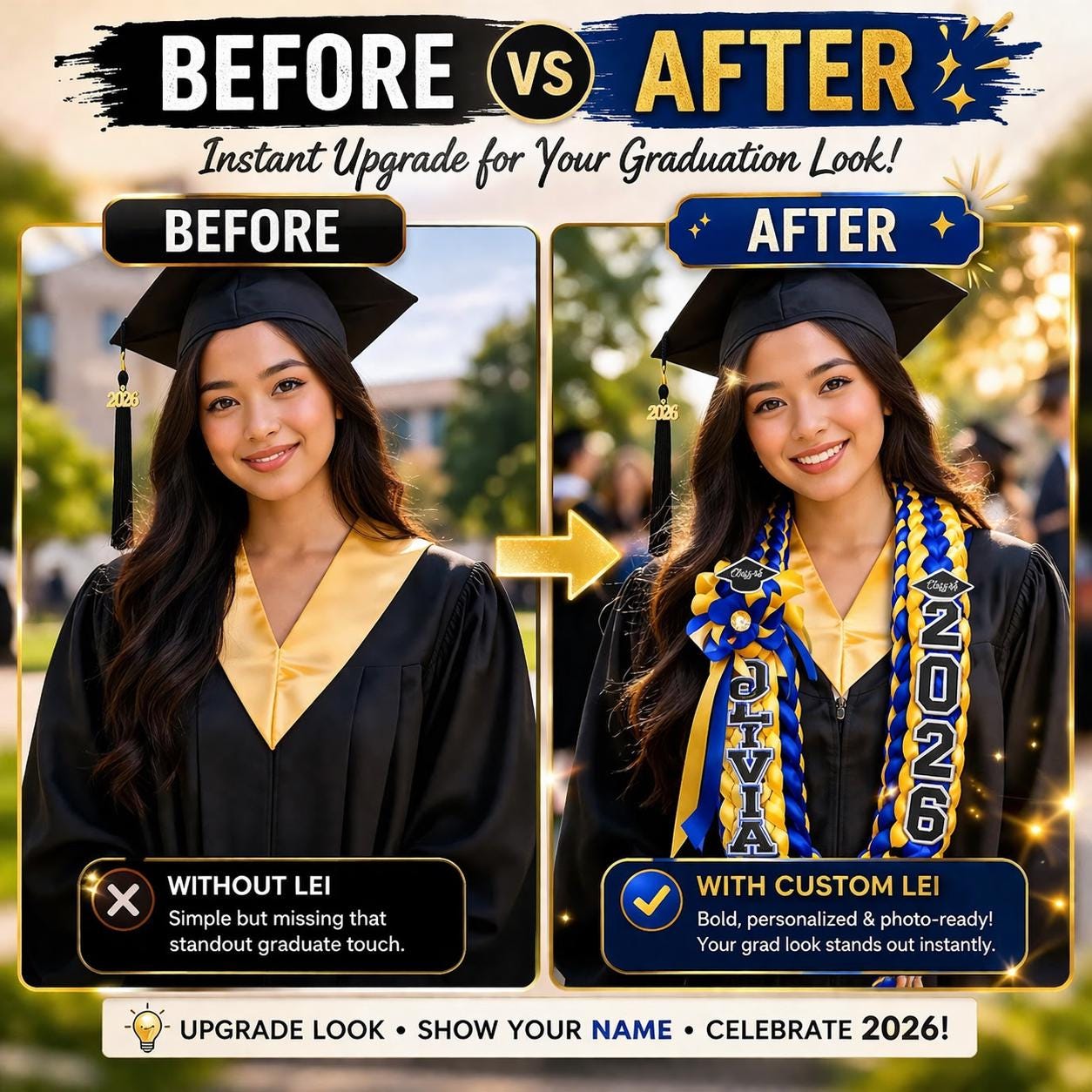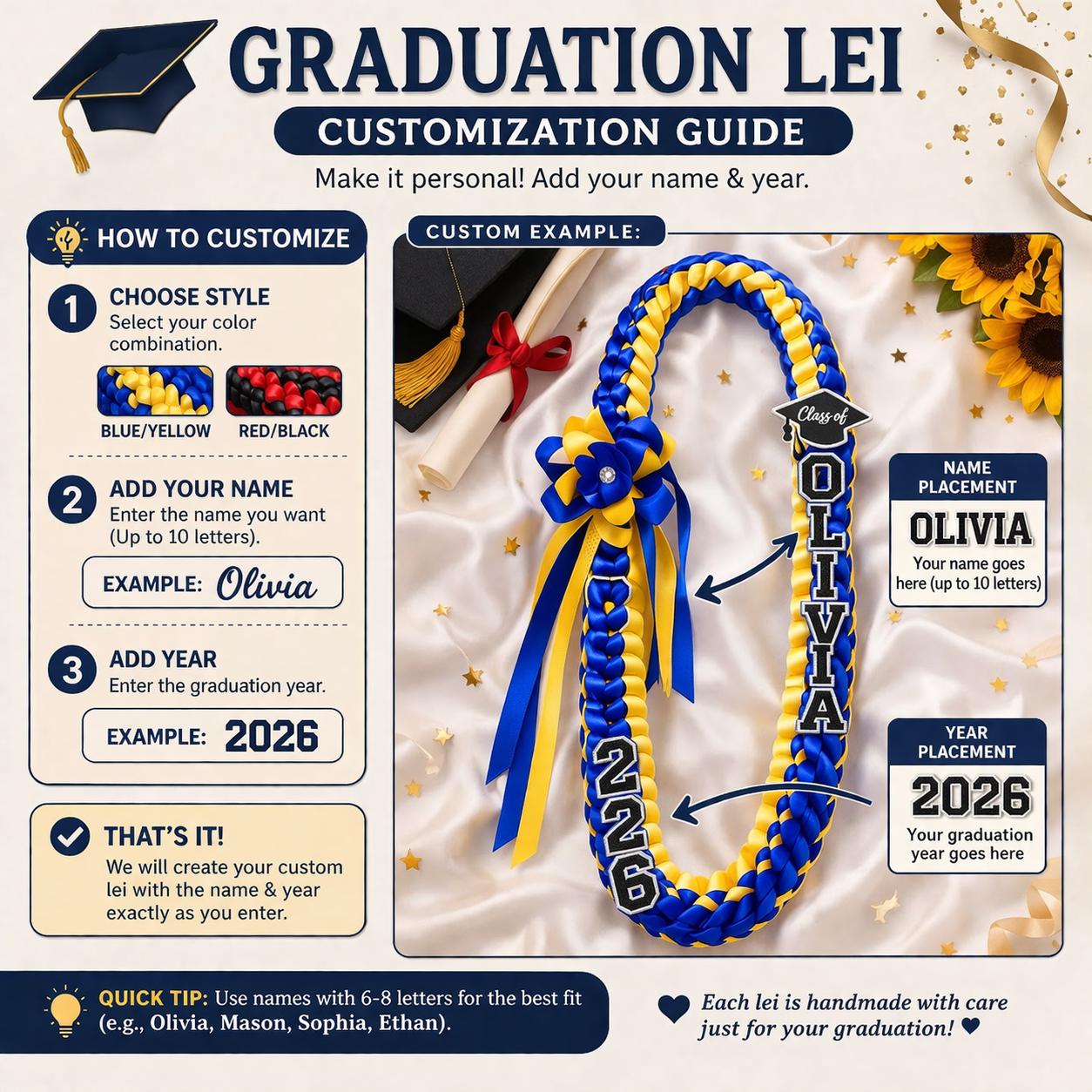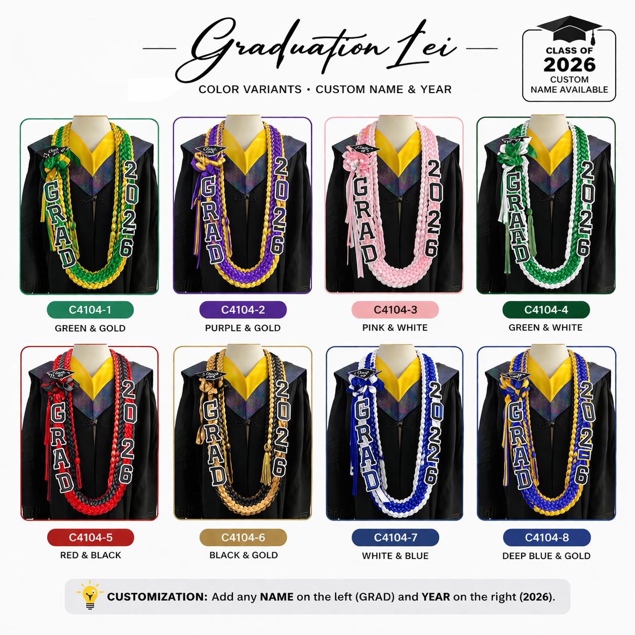 Célébrez le grand jour de votre diplômé avec une étole de graduation florale personnalisée/Lei 2026 ! Choisissez votre couleur préférée parmi 8 options étonnantes, personnalisez son nom, l'année et l'université maintenant pour créer un superbe accessoire artisanal qui rendra sa remise de diplôme inoubliable.