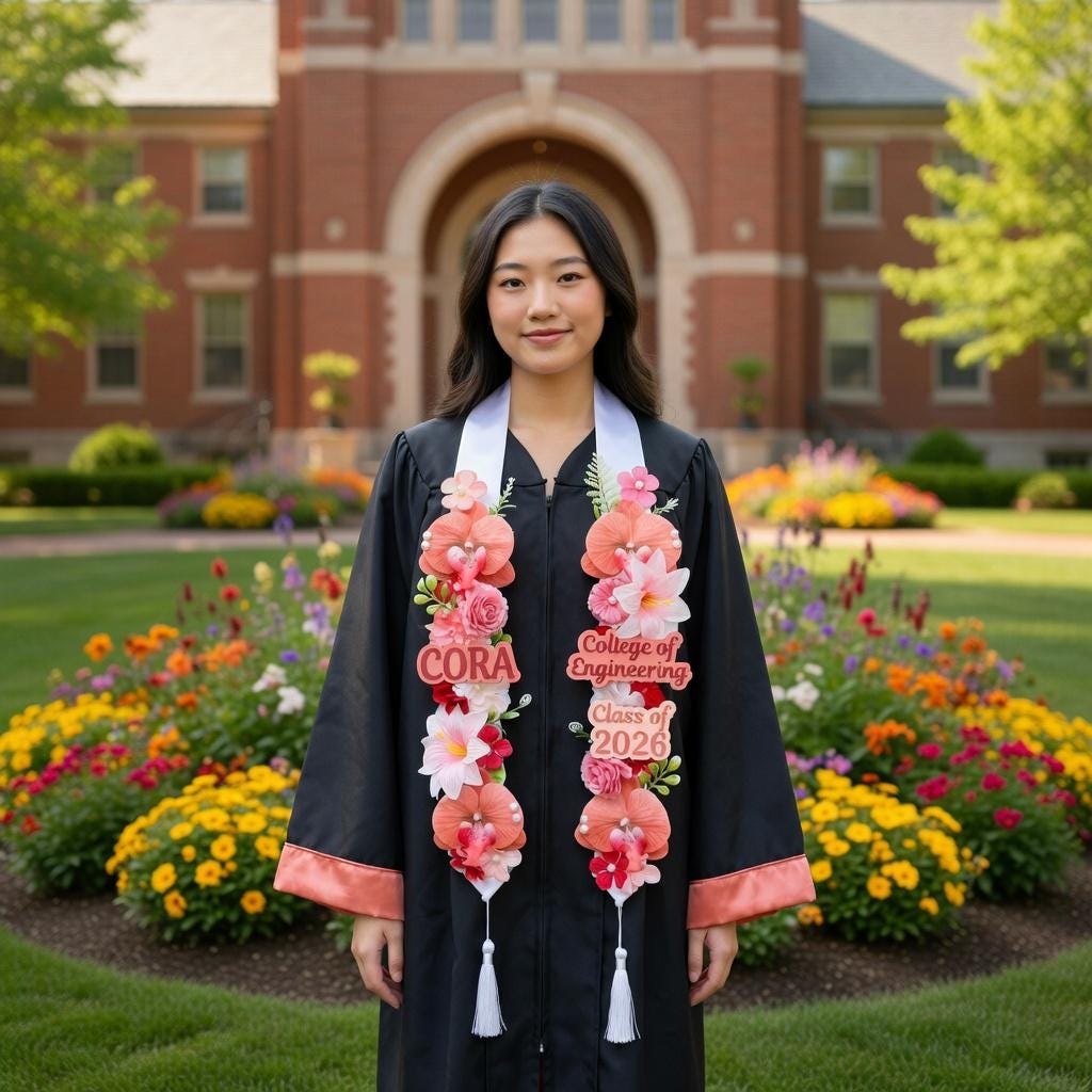 Cette étole florale personnalisée avec nom et université est un superbe accessoire de remise de diplômes fabriqué à la main et conçu pour célébrer avec style la promotion 2026. Sa base en satin blanc doux est ornée de cinq couleurs différentes au choix, de lettres personnalisées indiquant le nom, l'université/la spécialisation et l'année de remise des diplômes, ainsi que d'élégants pompons blancs, créant ainsi un souvenir significatif et accrocheur qui honore les résultats scolaires et le parcours unique du diplômé.