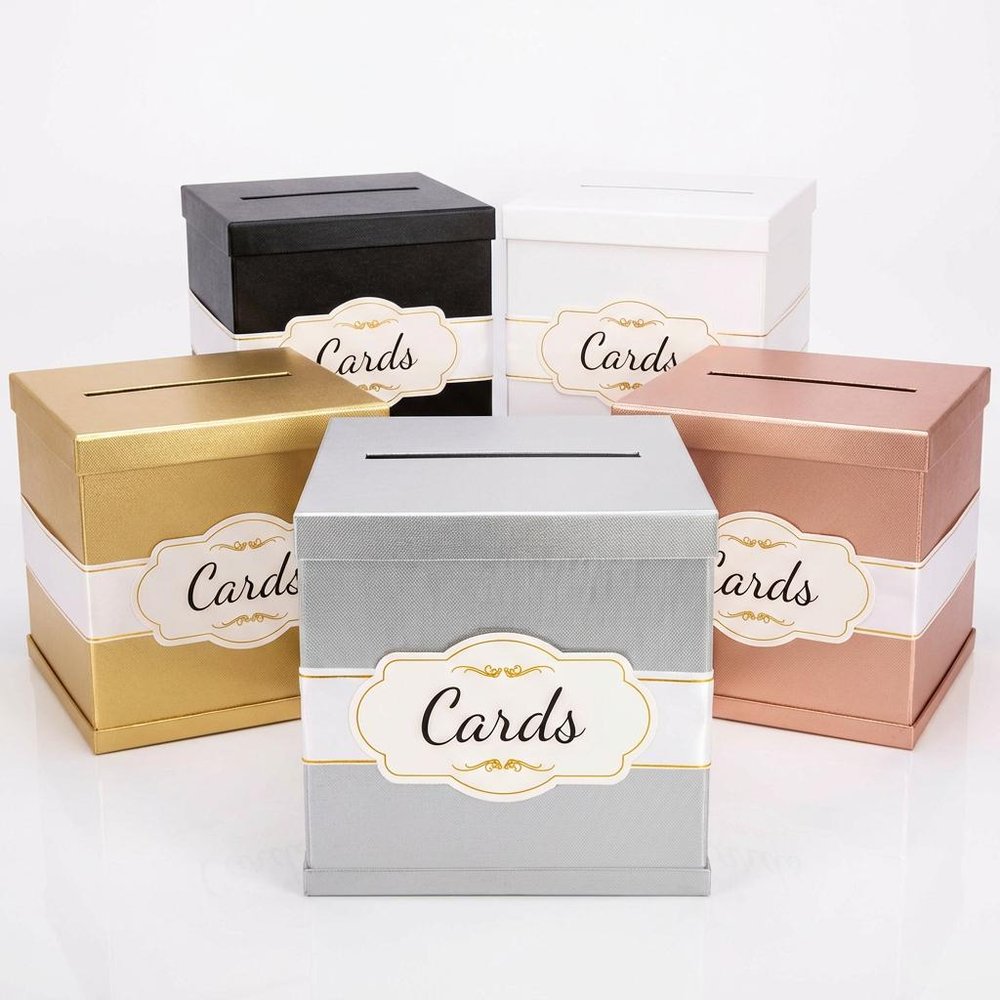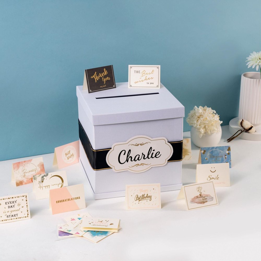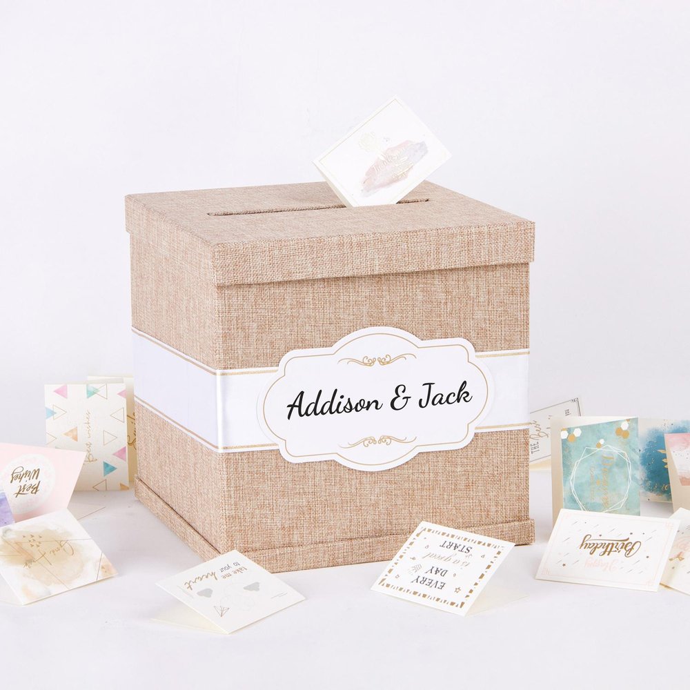 Rendez votre cadeau encore plus spécial avec cette boîte à cartes cadeaux personnalisée - un bel objet robuste conçu pour contenir 100 à 120 cartes cadeaux (en fonction de l'épaisseur de la carte). Avec un nom personnalisé ou le texte d'un événement, cette boîte élégante est parfaite pour les mariages, les remises de diplômes, les anniversaires ou toute autre célébration où vous souhaitez offrir un cadeau avec style et signification.