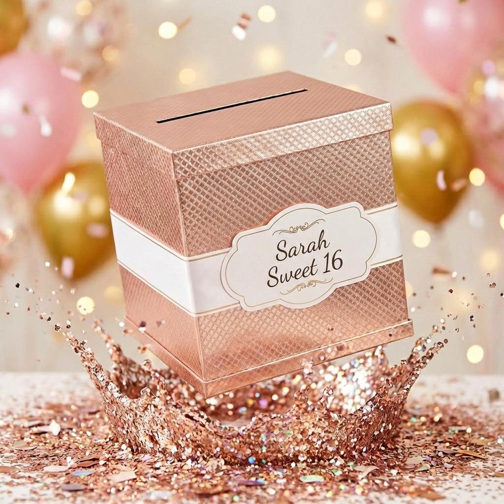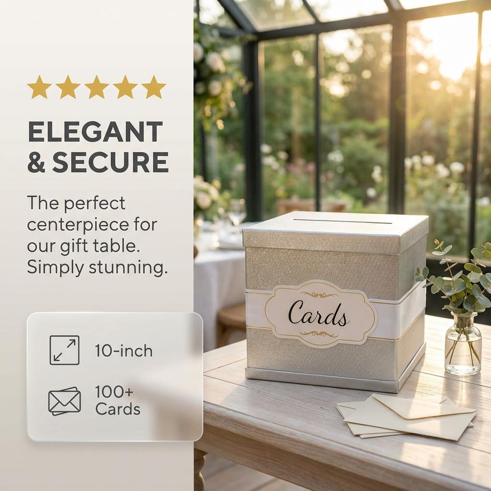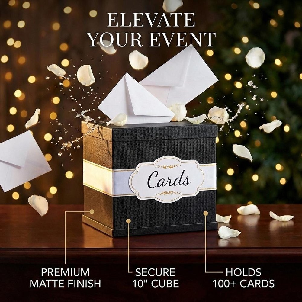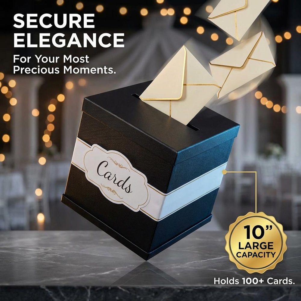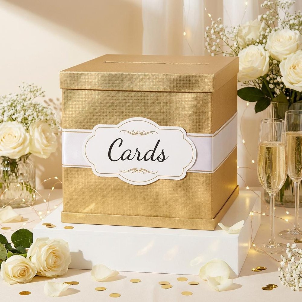 Fabriquée en papier brillant et durable avec une finition luxueuse, cette boîte mesure 10 × 10 × 10 pouces - la taille idéale pour les cartes-cadeaux, l'argent liquide ou les petits objets sentimentaux. Elle est accompagnée d'un élégant ruban blanc rehaussé d'une feuille d'or, qui ajoute une touche de sophistication. Une carte préimprimée est incluse, avec la possibilité d'ajouter une carte personnalisée supplémentaire pour une touche encore plus personnalisée.
