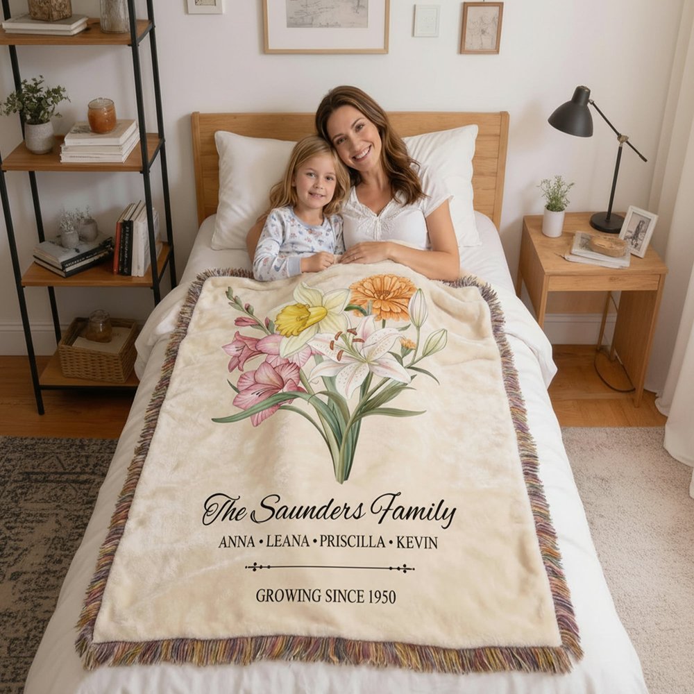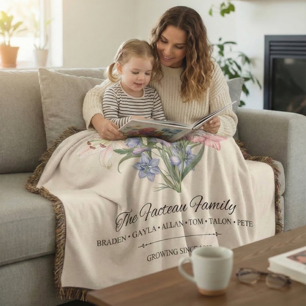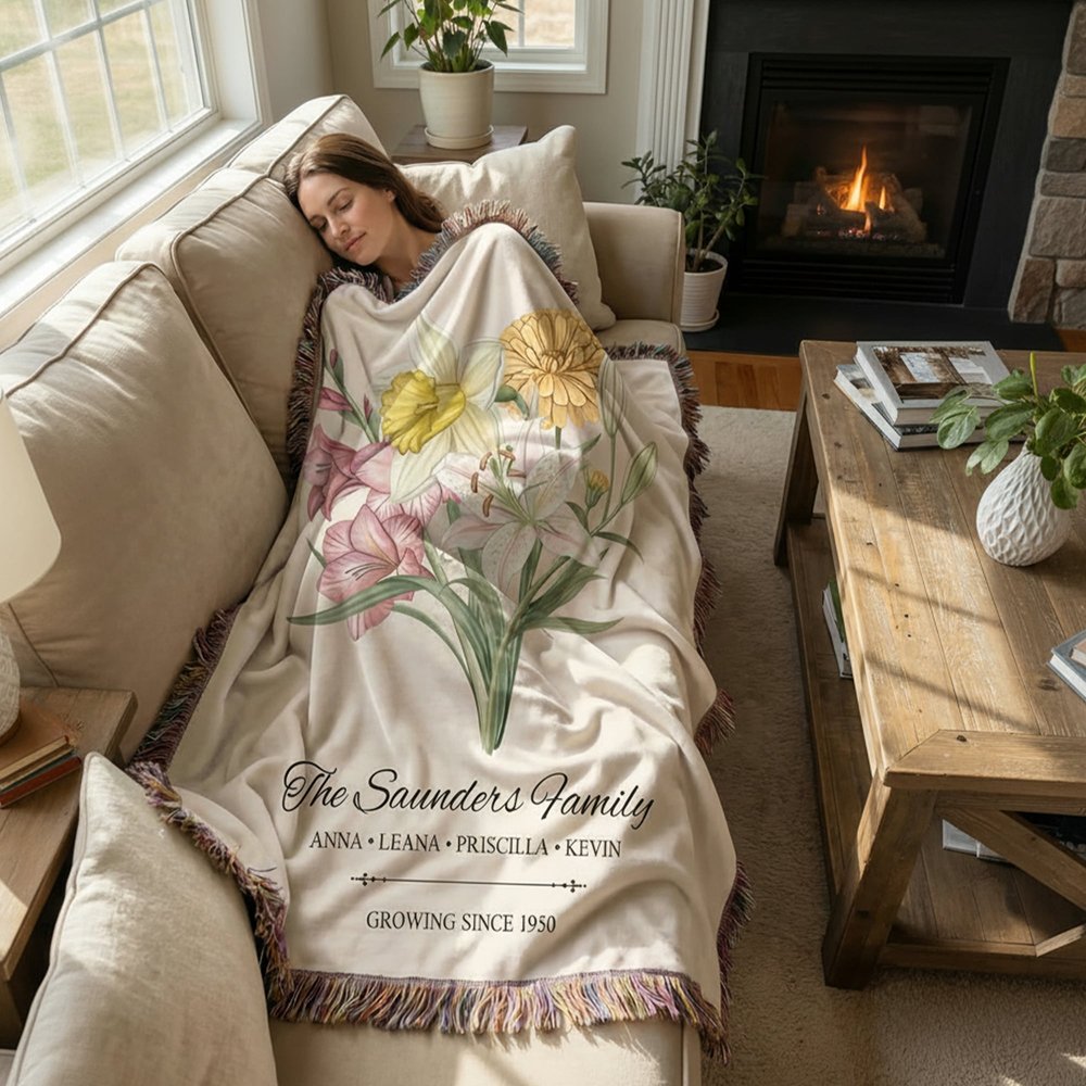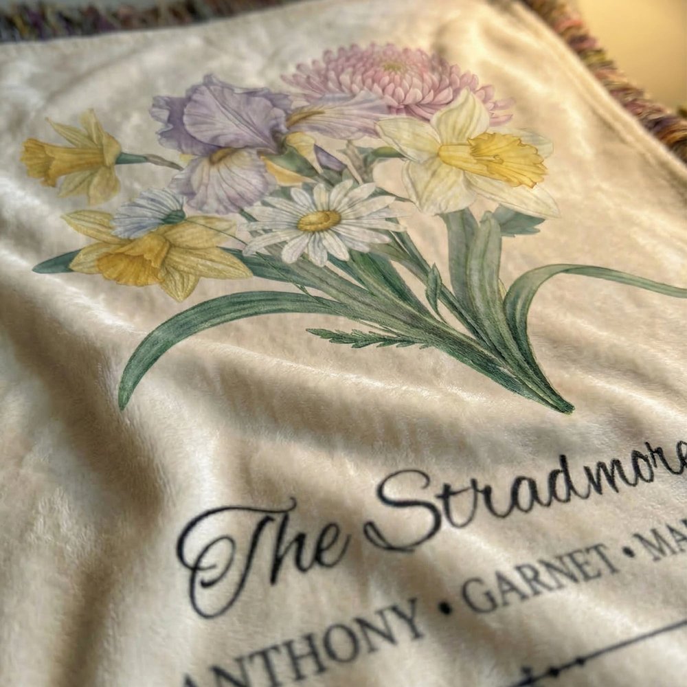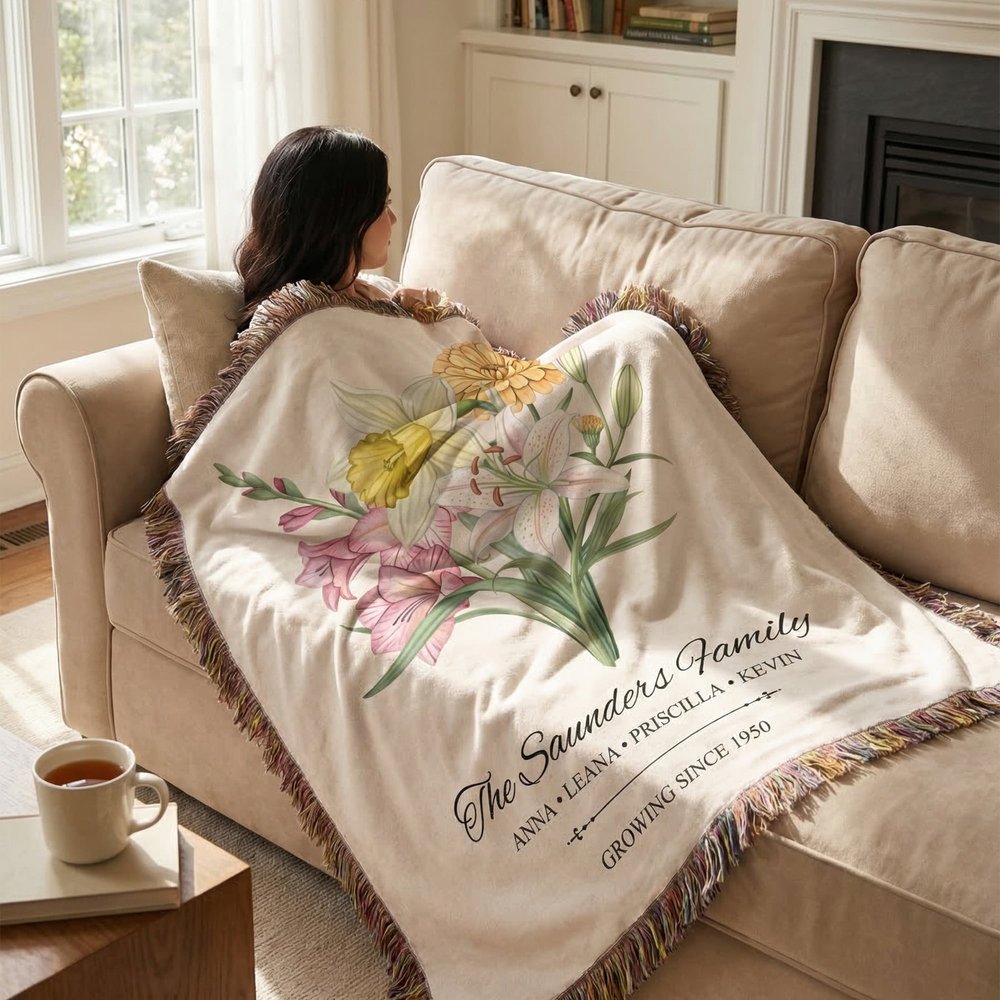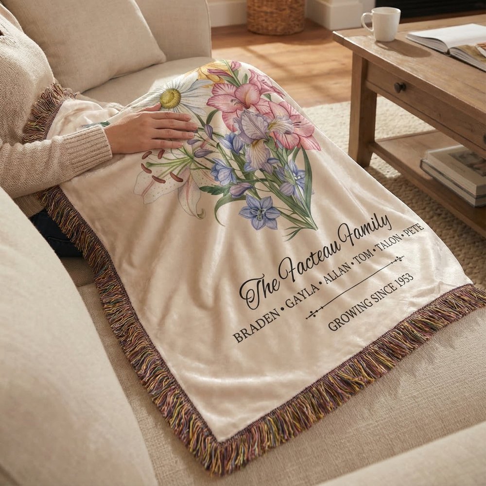 Avec 1 à 6 fleurs de naissance exquises personnalisables comme motif central, les couleurs douces et fraîches, ornées de pompons, créent un aspect général chaleureux et élégant. Plusieurs noms, titres et textes d'année peuvent être personnalisés, ce qui confère au produit une signification unique, alliant l'esthétique à une signification commémorative distinctive.
