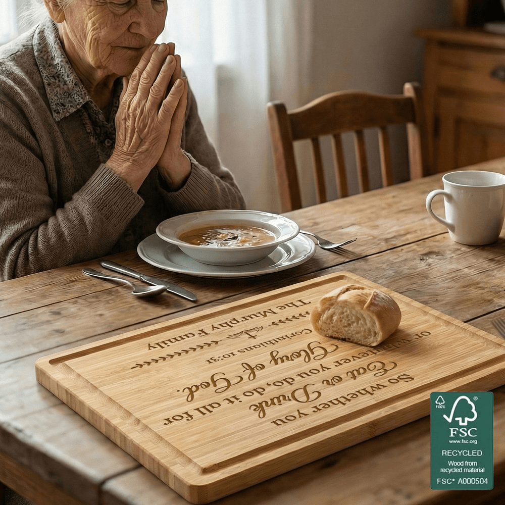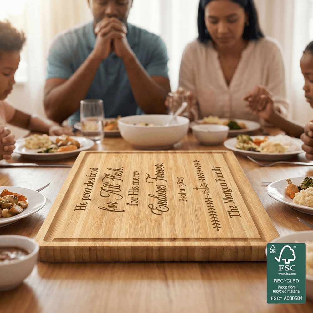 Centrée autour d'une croix sacrée, cette planche à découper propose six styles de versets bibliques différents, apportant la chaleur et la force de la foi dans la vie quotidienne de la cuisine. Personnalisée avec votre nom de famille, chaque planche devient une pièce unique, permettant à chaque utilisation de refléter la gratitude, la grâce et la dévotion spirituelle.