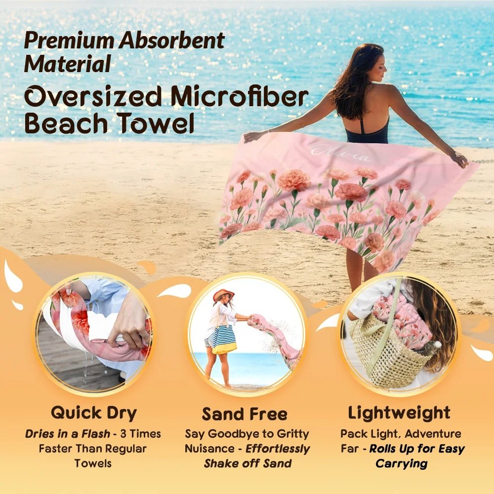 Ornée d'élégants motifs de fleurs de naissance, cette serviette de plage peut également être personnalisée avec un nom. Elle allie une beauté florale délicate à une ambiance estivale fraîche, créant ainsi une pièce unique et exclusive qui rendra vos moments passés au bord de l'eau plus élégants et plus mémorables.