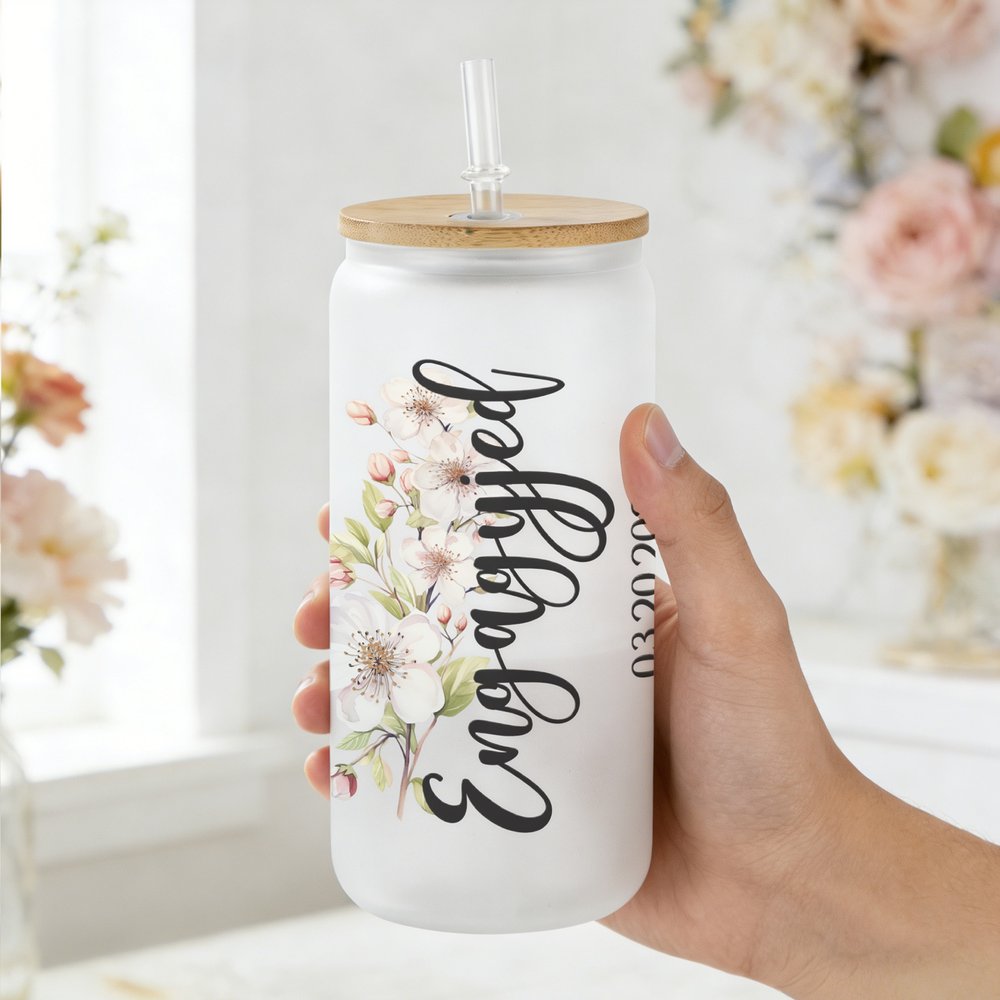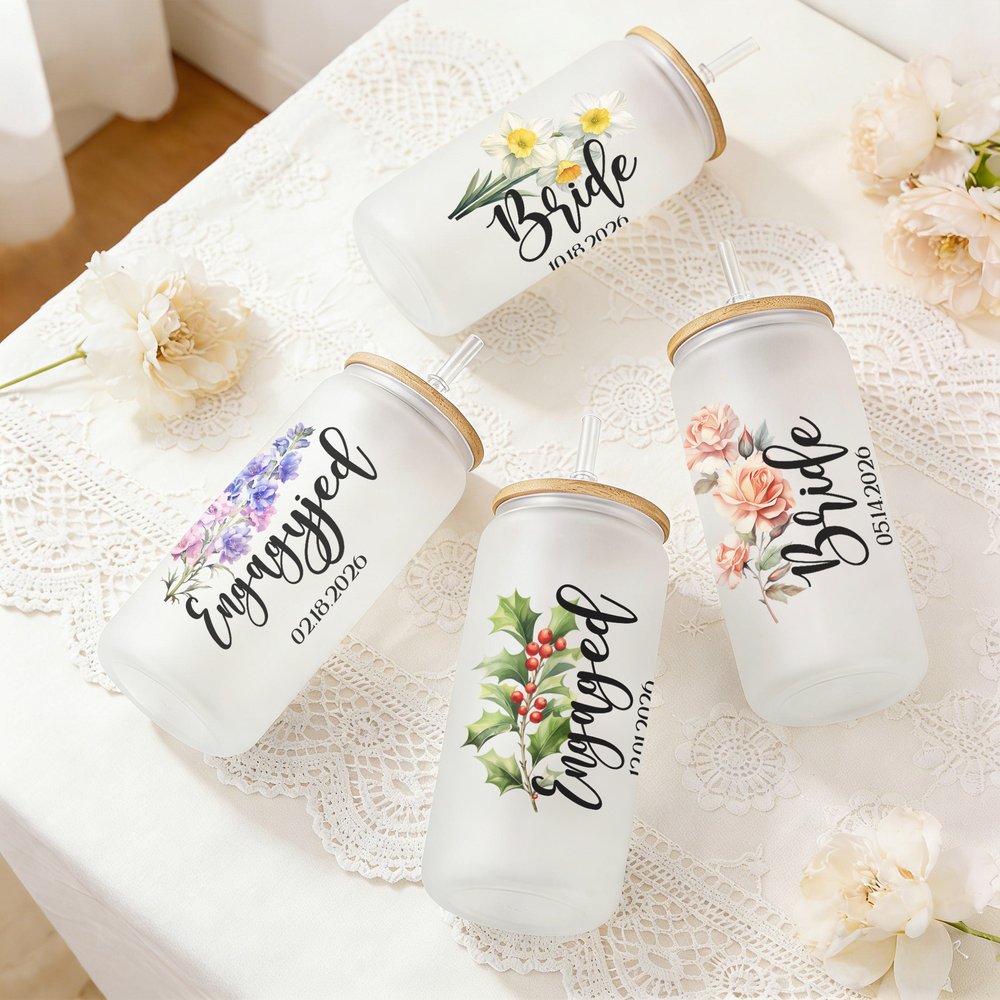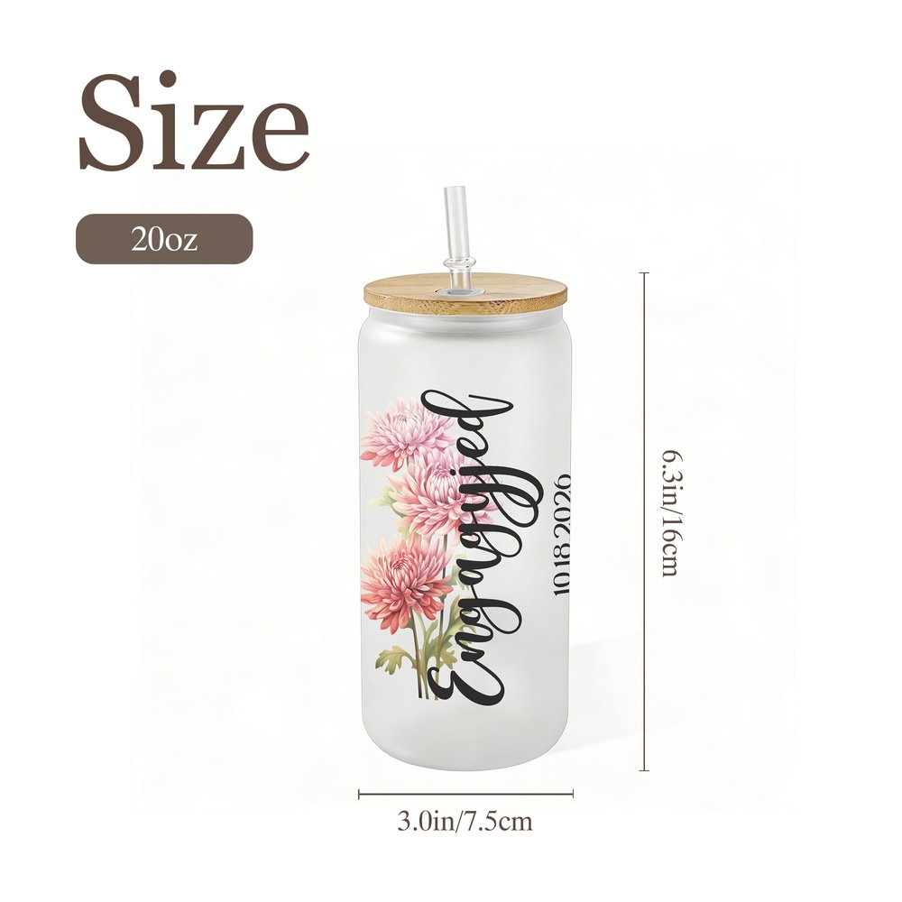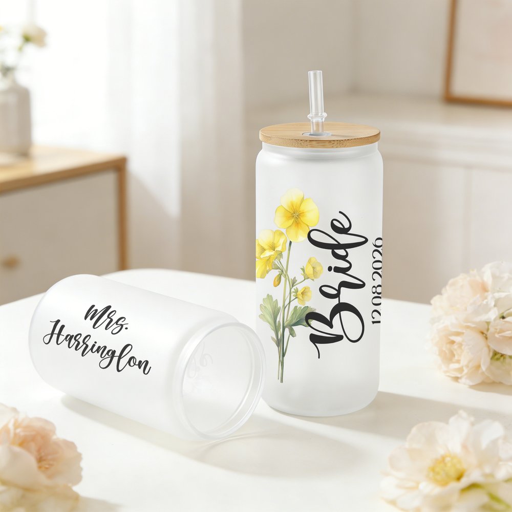 Ce verre présente un magnifique design romantique orné de délicats motifs floraux de naissance et peut être personnalisé avec du texte, des noms et des dates de mariage. Le motif floral exquis correspond au mois de naissance de la mariée, chaque fleur symbolisant l'amour et les nouveaux départs. Le design général allie habilement l'élégance des plantes à une typographie épurée et moderne, créant ainsi une pièce classique et intemporelle, mais aussi profondément personnelle.