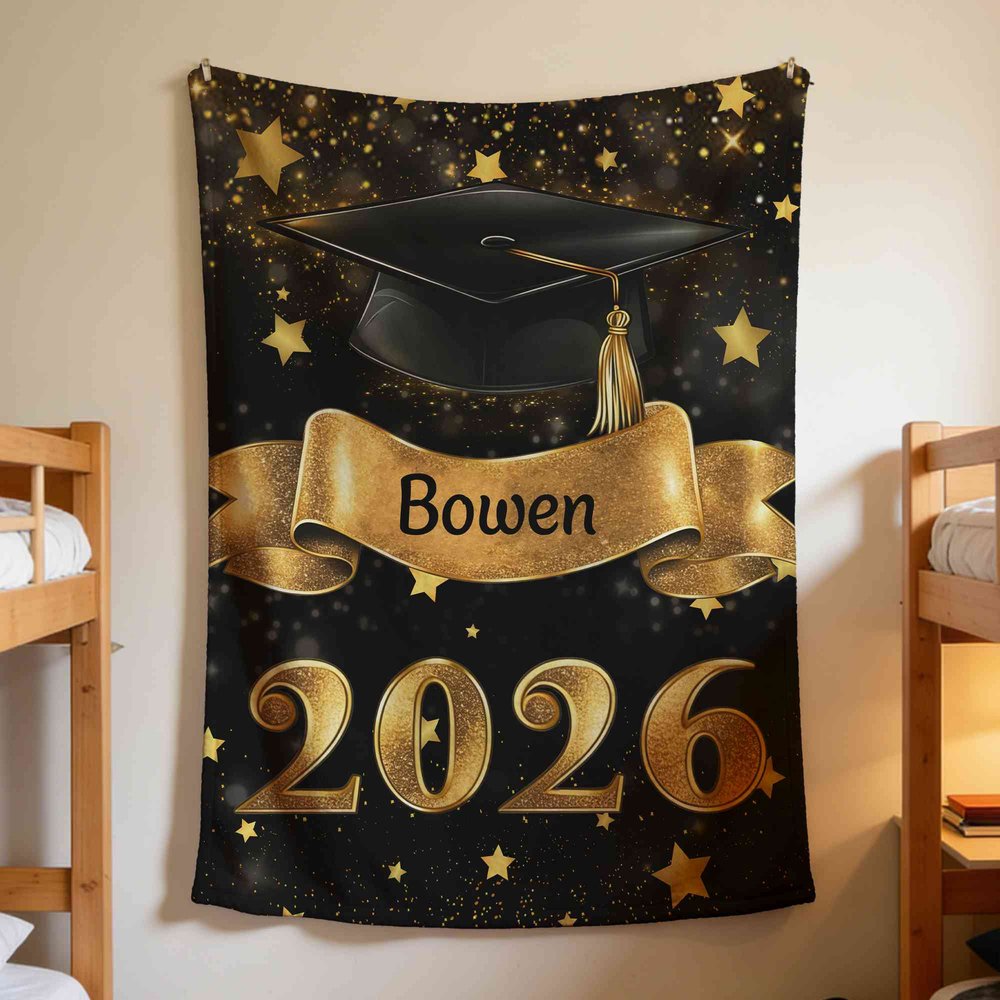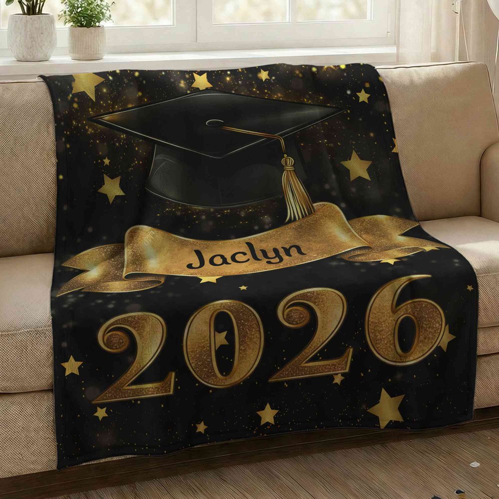 Cette couverture de bonnet de fin d'études noir et or personnalisée est un souvenir luxueux et significatif conçu pour célébrer la promotion 2026. Elle présente un motif noir et or audacieux avec un bonnet de fin d'études, des étoiles scintillantes et une bannière déroulante personnalisée indiquant le nom du diplômé et l'année d'obtention du diplôme. C'est le cadeau de fin d'études par excellence pour les diplômés, alliant confort douillet et style festif intemporel.