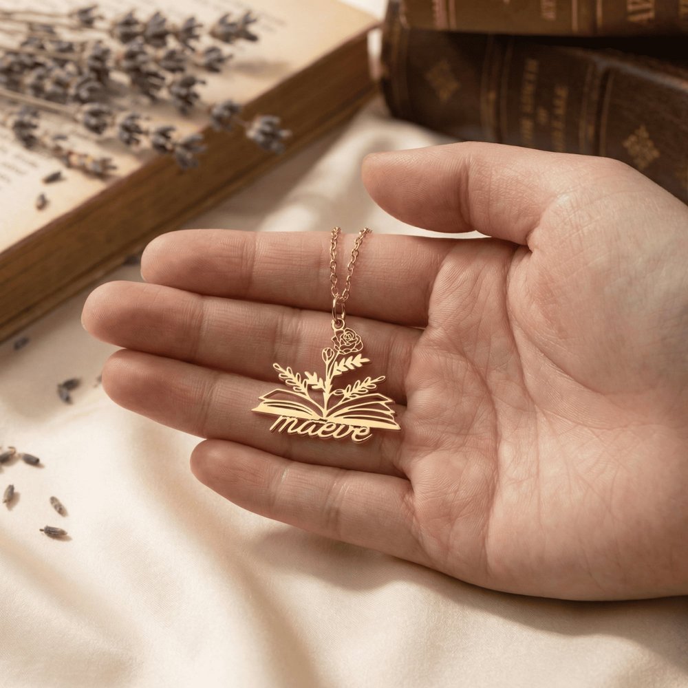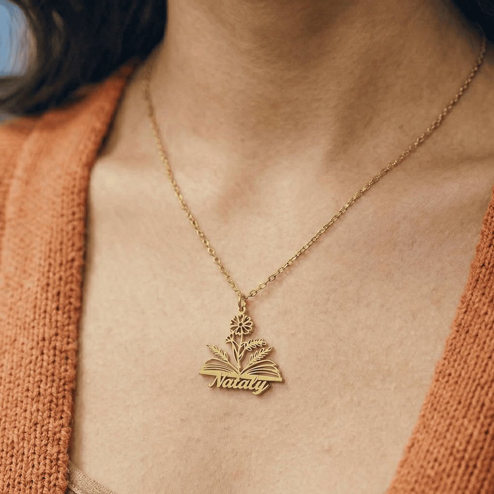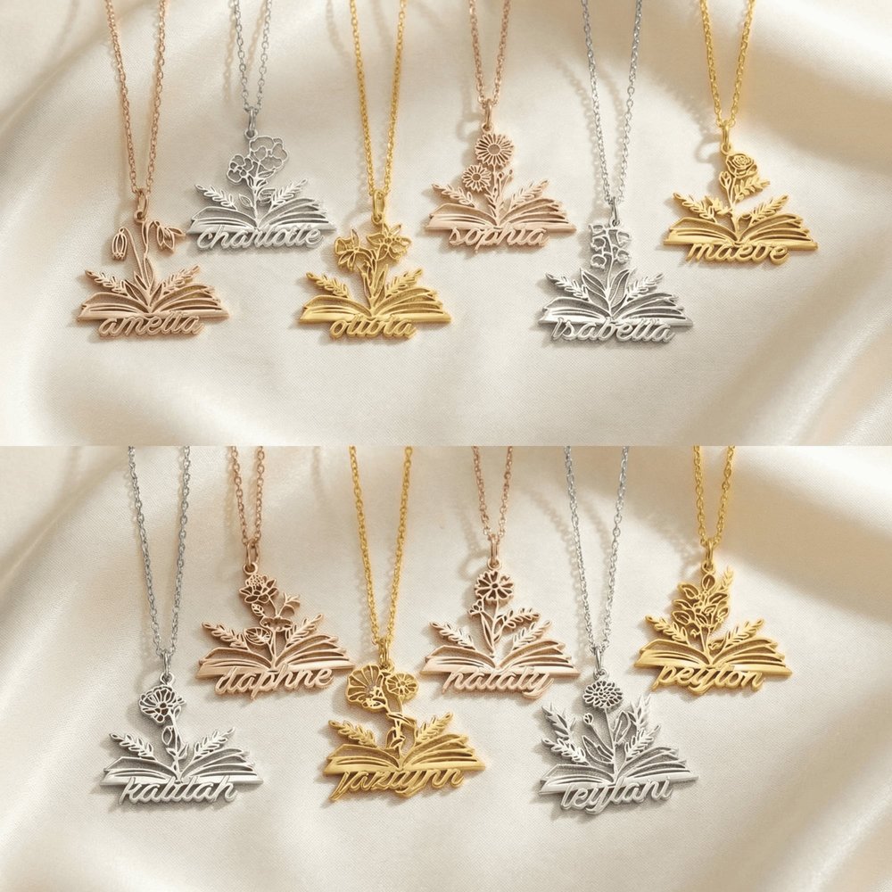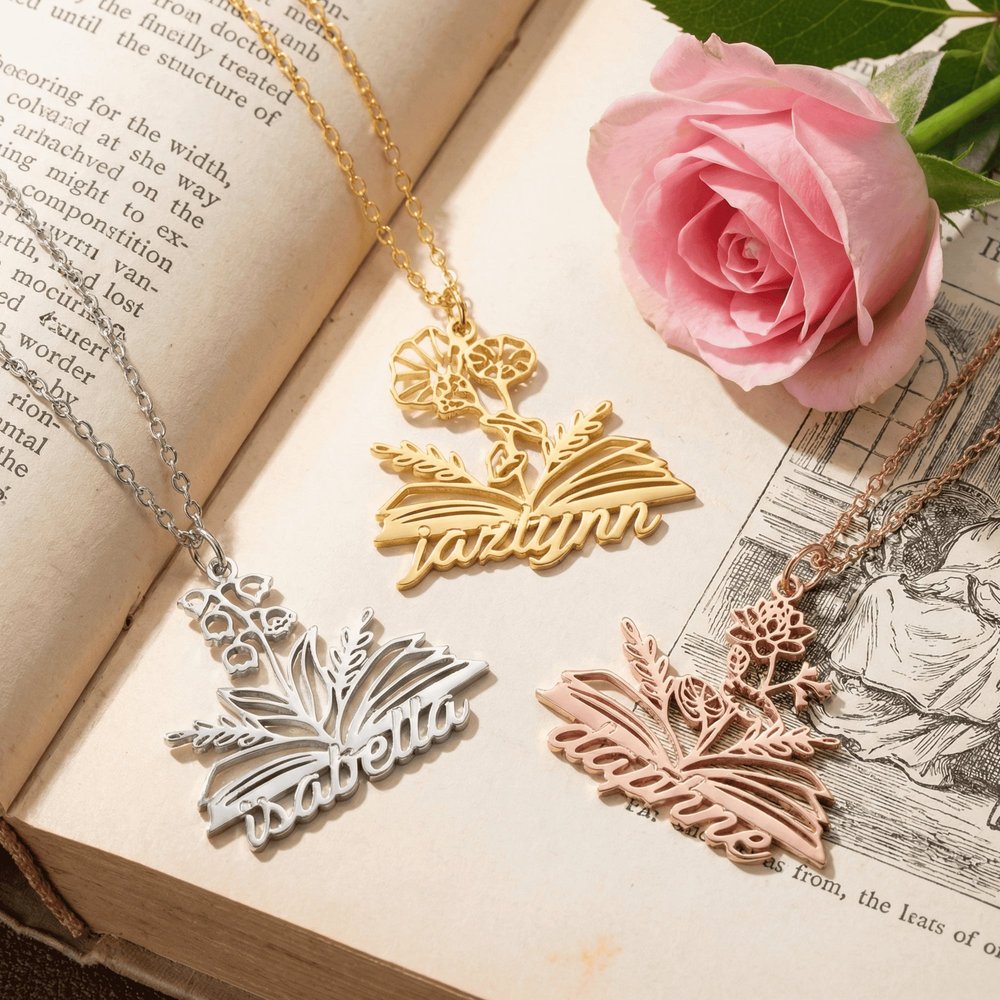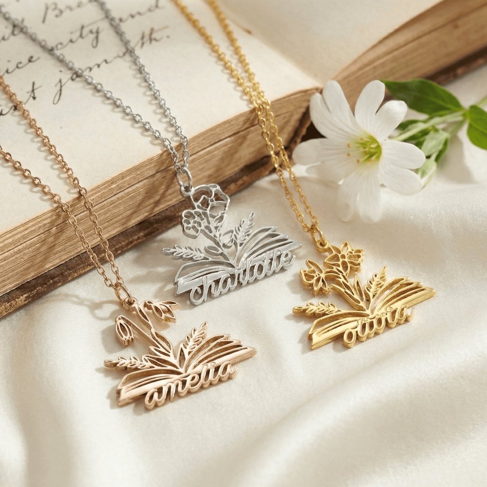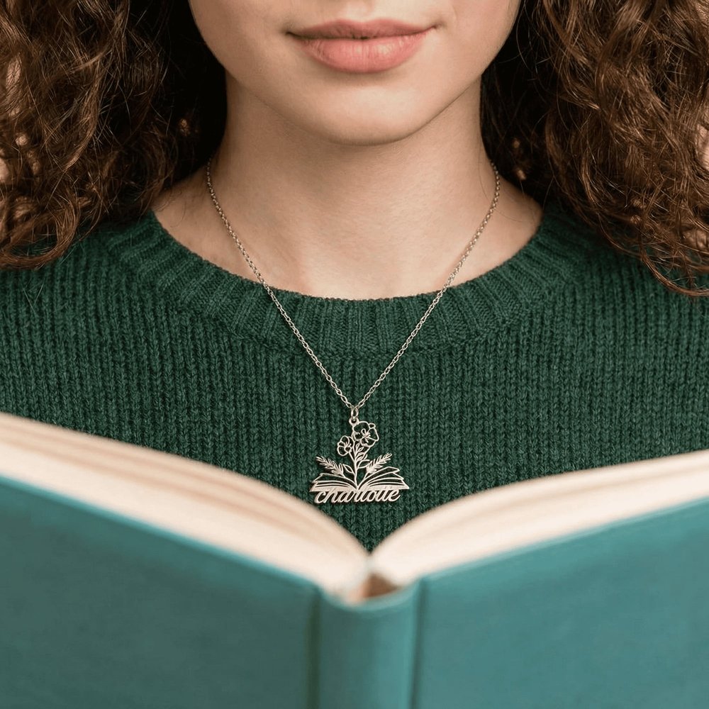 Commandez dès aujourd'hui votre collier de fleurs de naissance personnalisé pour amoureux des livres, car toute belle histoire mérite d'être portée près du cœur.