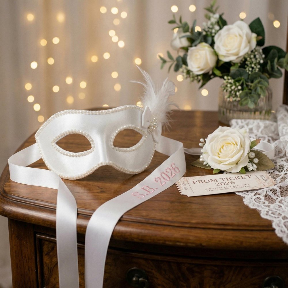 Ce masque de bal de fin d'année brodé avec nom et année est l'accessoire ultime pour créer des souvenirs inoubliables de la nuit de bal de fin d'année, conçu pour exsuder un mystère élégant tout en ajoutant une touche unique et personnelle. Le masque en satin blanc est orné de délicates perles, d'un charmant nœud de plumes et de broderies personnalisables, ce qui en fait l'accessoire idéal pour les diplômés qui se rendent à leur bal de fin d'année ou à leur cérémonie de remise des diplômes.