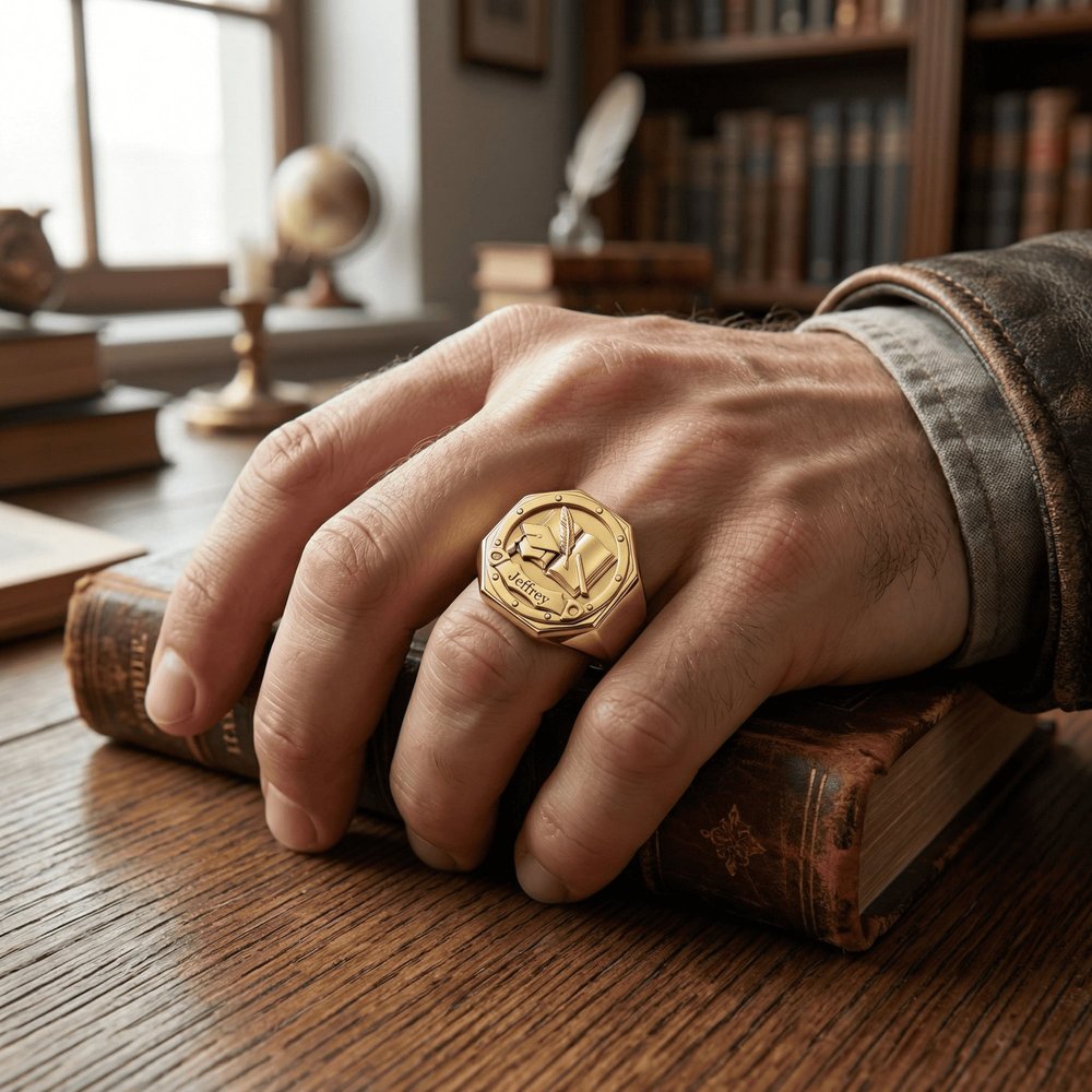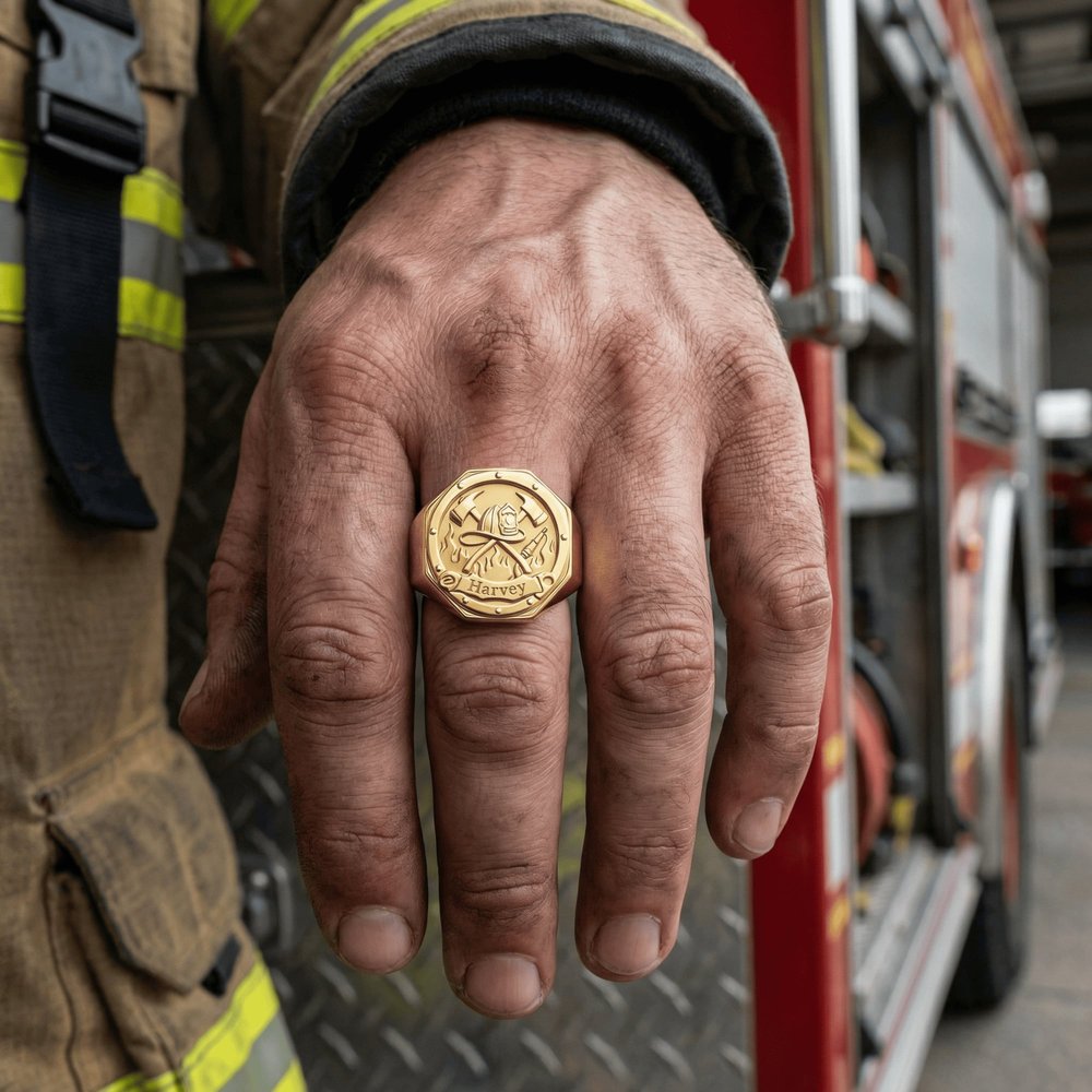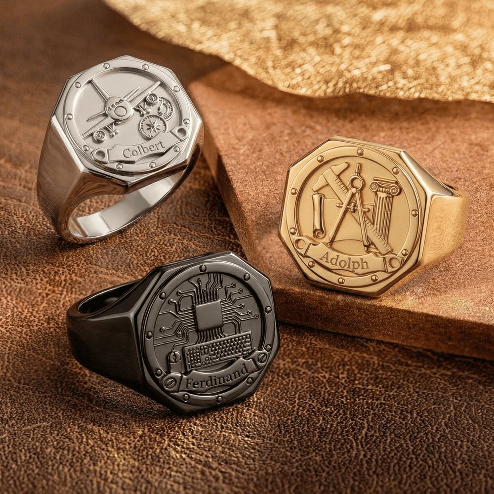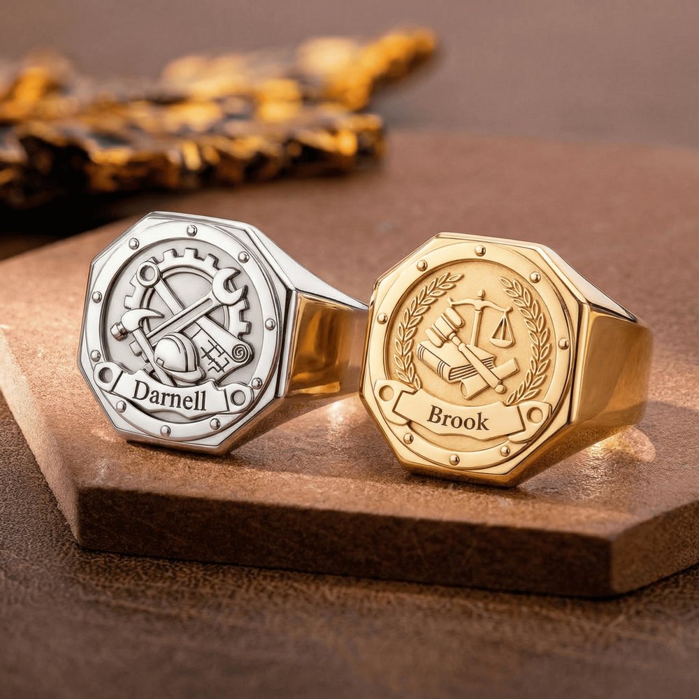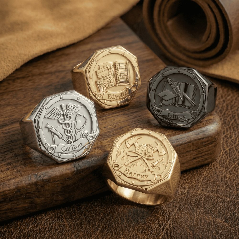 Célébrez son parcours professionnel avec une bague professionnelle pour homme personnalisée et gravée ! Choisissez dès maintenant le motif de votre carrière, le matériau et votre nom personnalisé pour créer une bague durable, élégante et significative qui rend hommage à son travail acharné et à sa fierté.