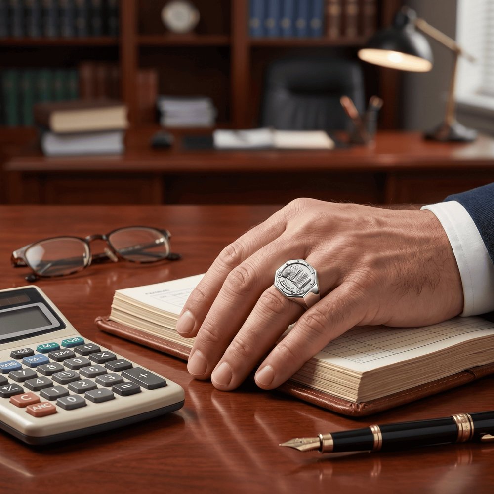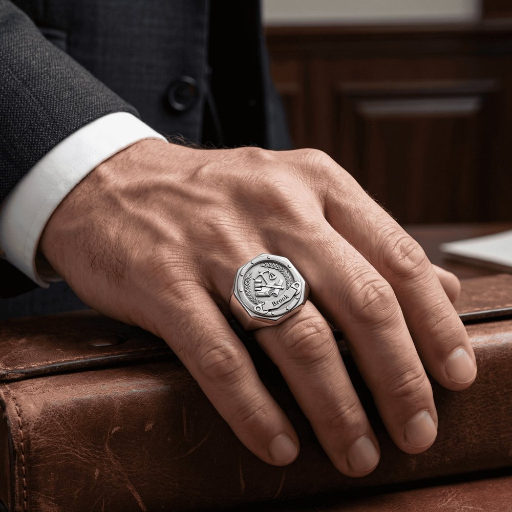 Conçue pour s'adapter à tous les moments de sa vie, cette bague est l'accessoire polyvalent par excellence pour toutes les occasions. Qu'il se rende à une réunion d'équipe, à une réunion de famille ou à une soirée, cette bague ajoute une touche subtile et sophistiquée de fierté professionnelle et de style personnel qui complète chaque look, garantissant qu'il peut porter sa réussite et son identité partout avec lui.