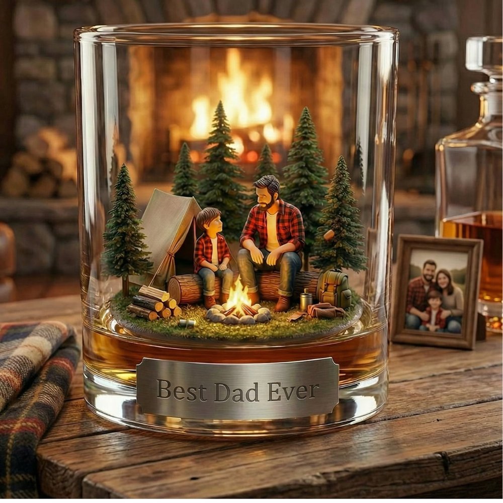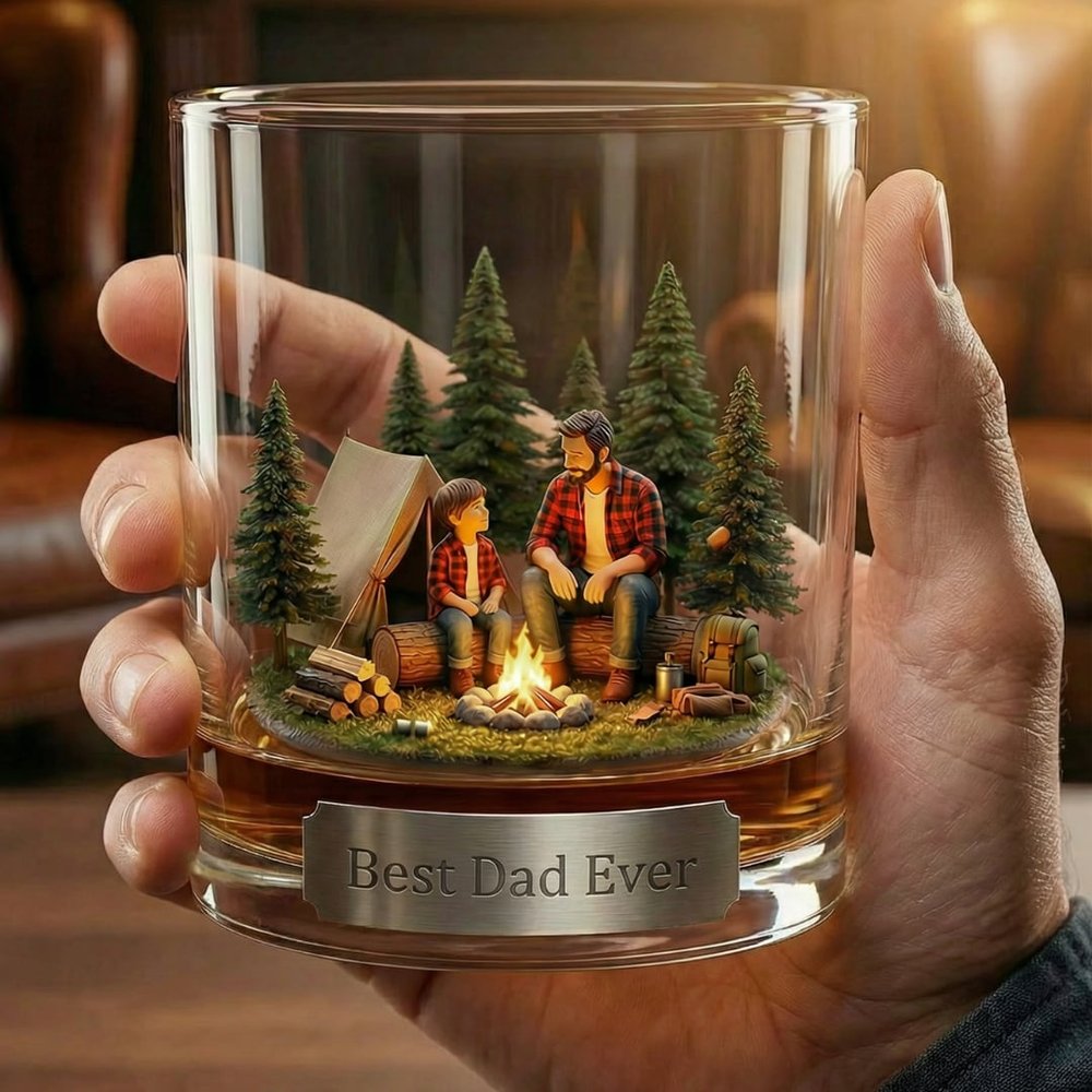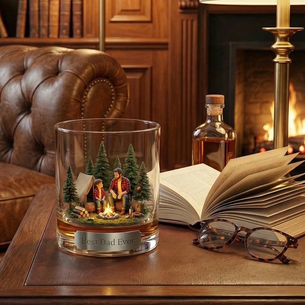 Ce verre à whisky personnalisé Père et fils avec scène de feu de camp présente une illustration 3D réconfortante d'un père et d'un fils partageant un moment agréable près d'un feu de camp dans une forêt de pins, associée à une plaque personnalisée pour ajouter une touche sincère et personnelle, transformant un simple verre à boire en un souvenir sentimental qui célèbre le lien indéfectible entre un père et un fils.