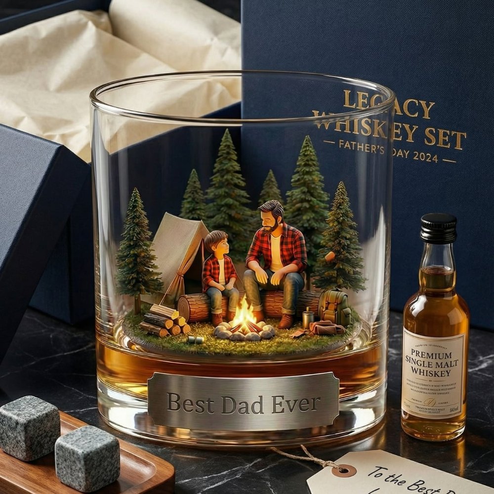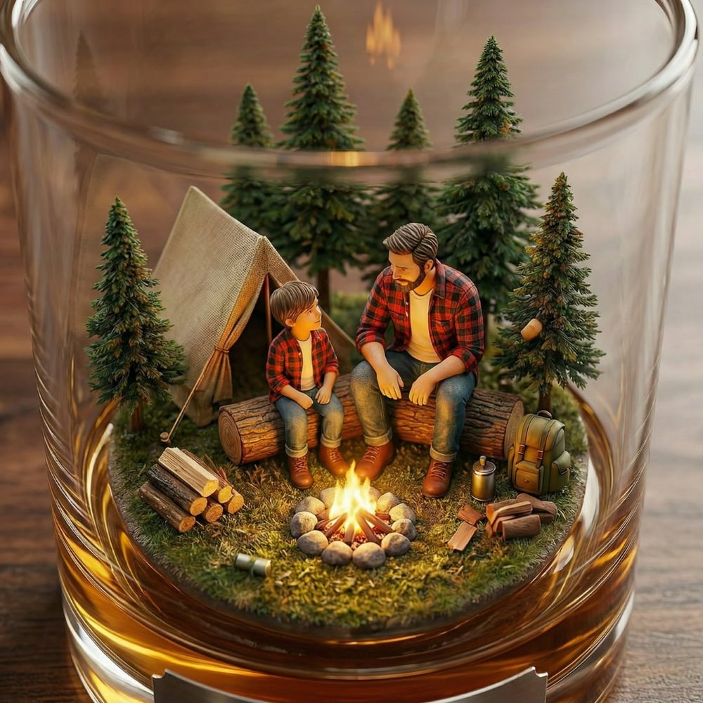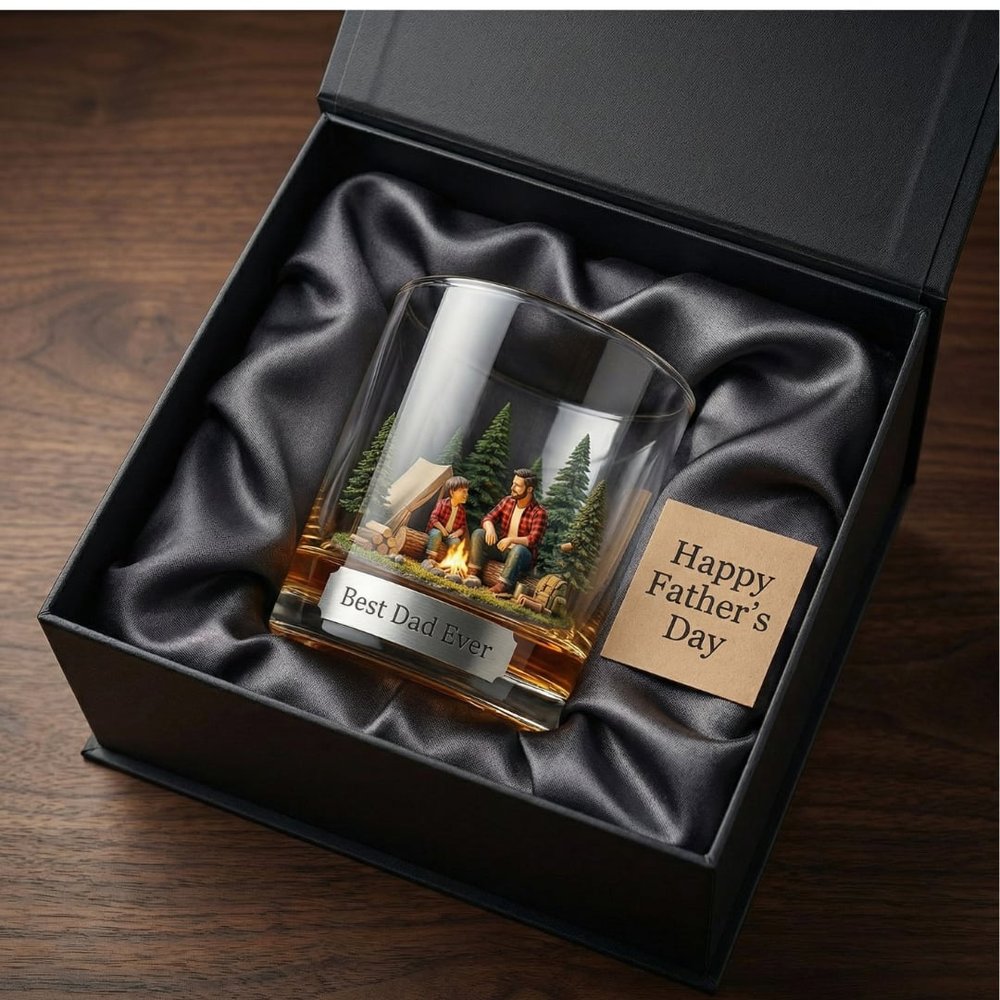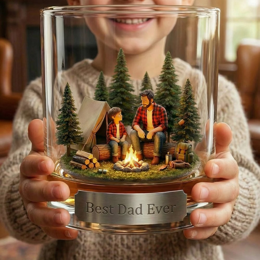 Ce verre à whisky personnalisé Père et fils avec scène de feu de camp présente une illustration 3D réconfortante d'un père et d'un fils partageant un moment agréable près d'un feu de camp dans une forêt de pins, associée à une plaque personnalisée pour ajouter une touche sincère et personnelle, transformant un simple verre à boire en un souvenir sentimental qui célèbre le lien indéfectible entre un père et un fils.