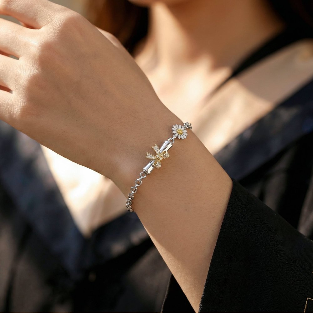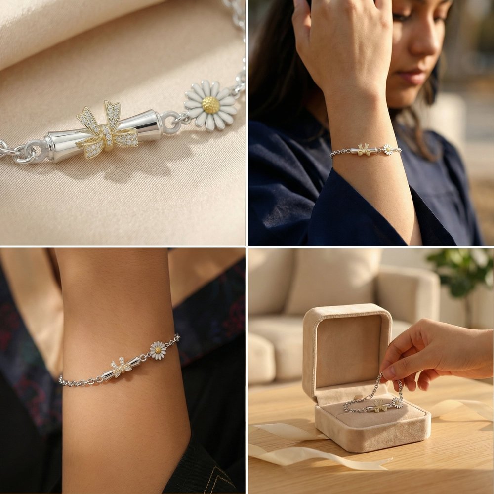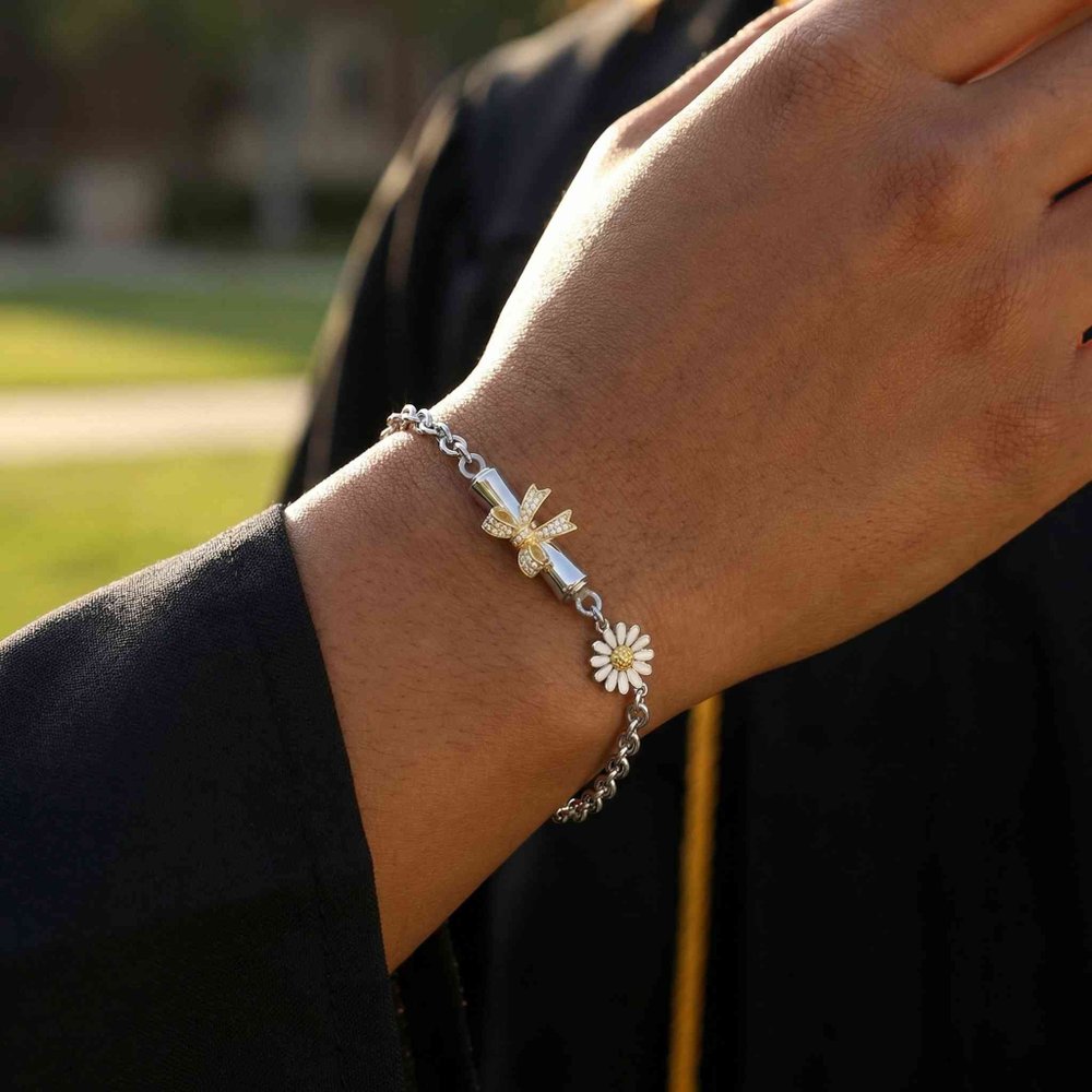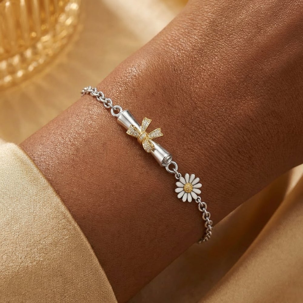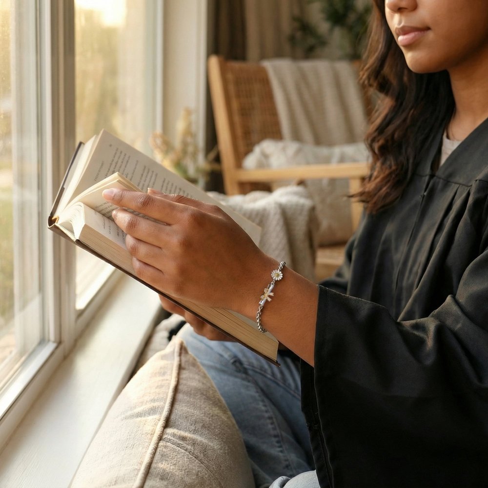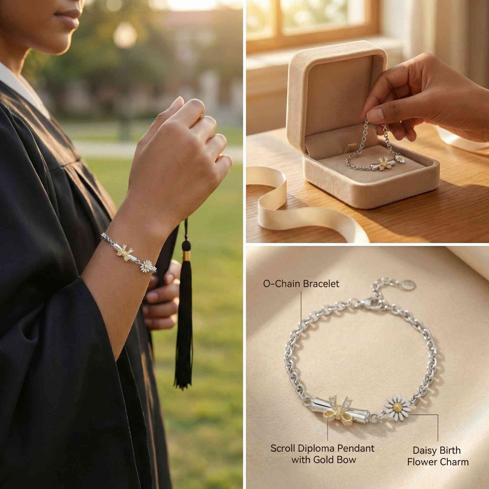 Célébrez cette étape importante avec un bracelet qui honore à la fois l'accomplissement et l'individualité. Avec sa fleur de naissance, cette pièce symbolise la croissance, l'espoir et un avenir radieux. Elle est accompagnée d'une délicate breloque en forme de parchemin de fin d'études qui représente son succès durement acquis.