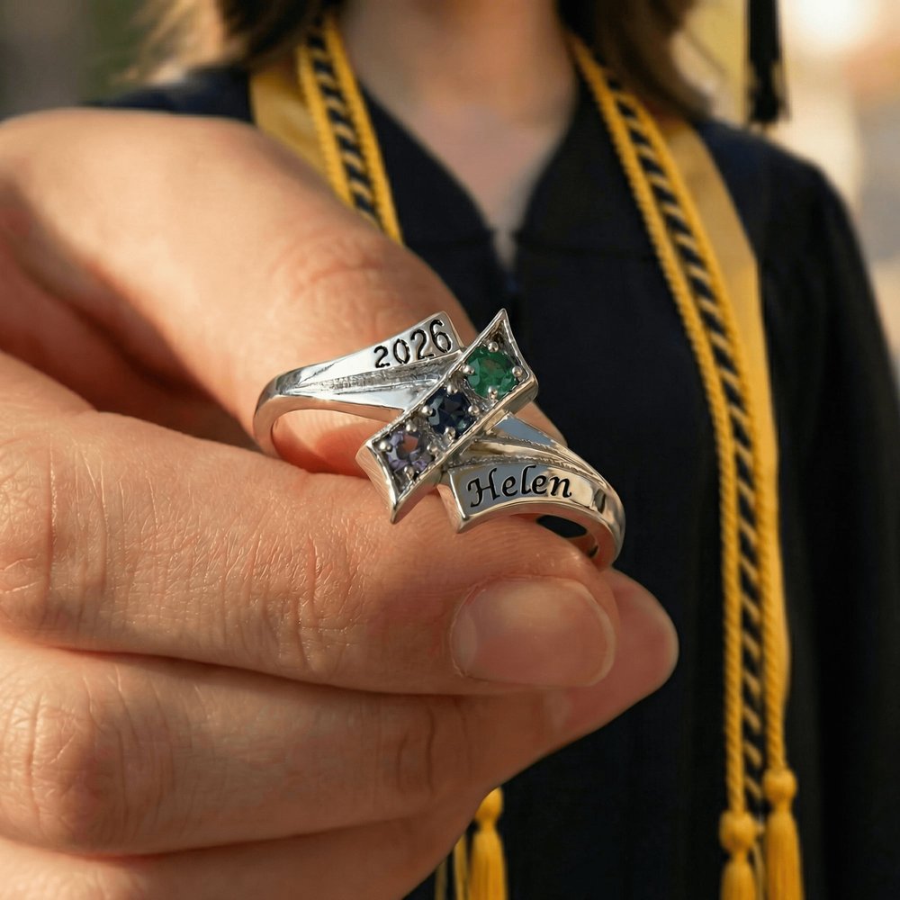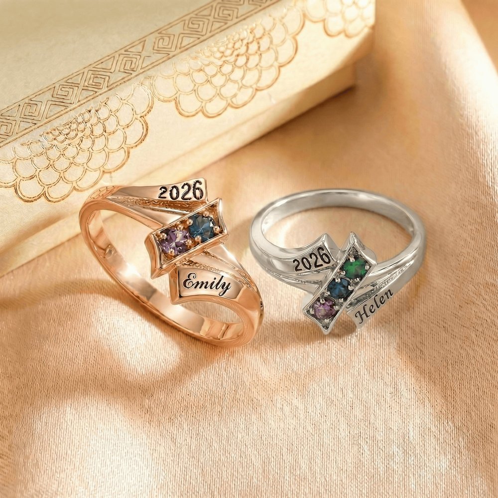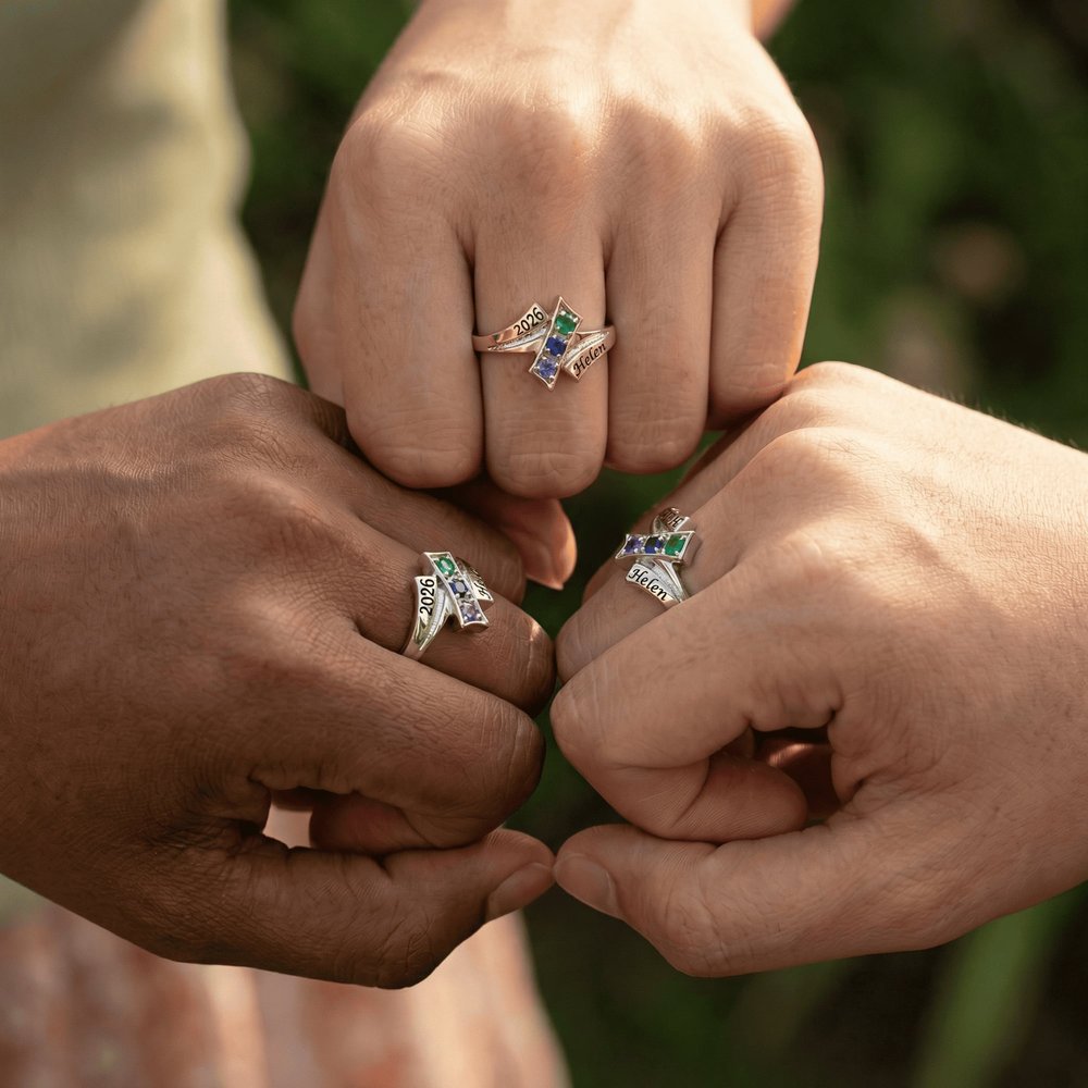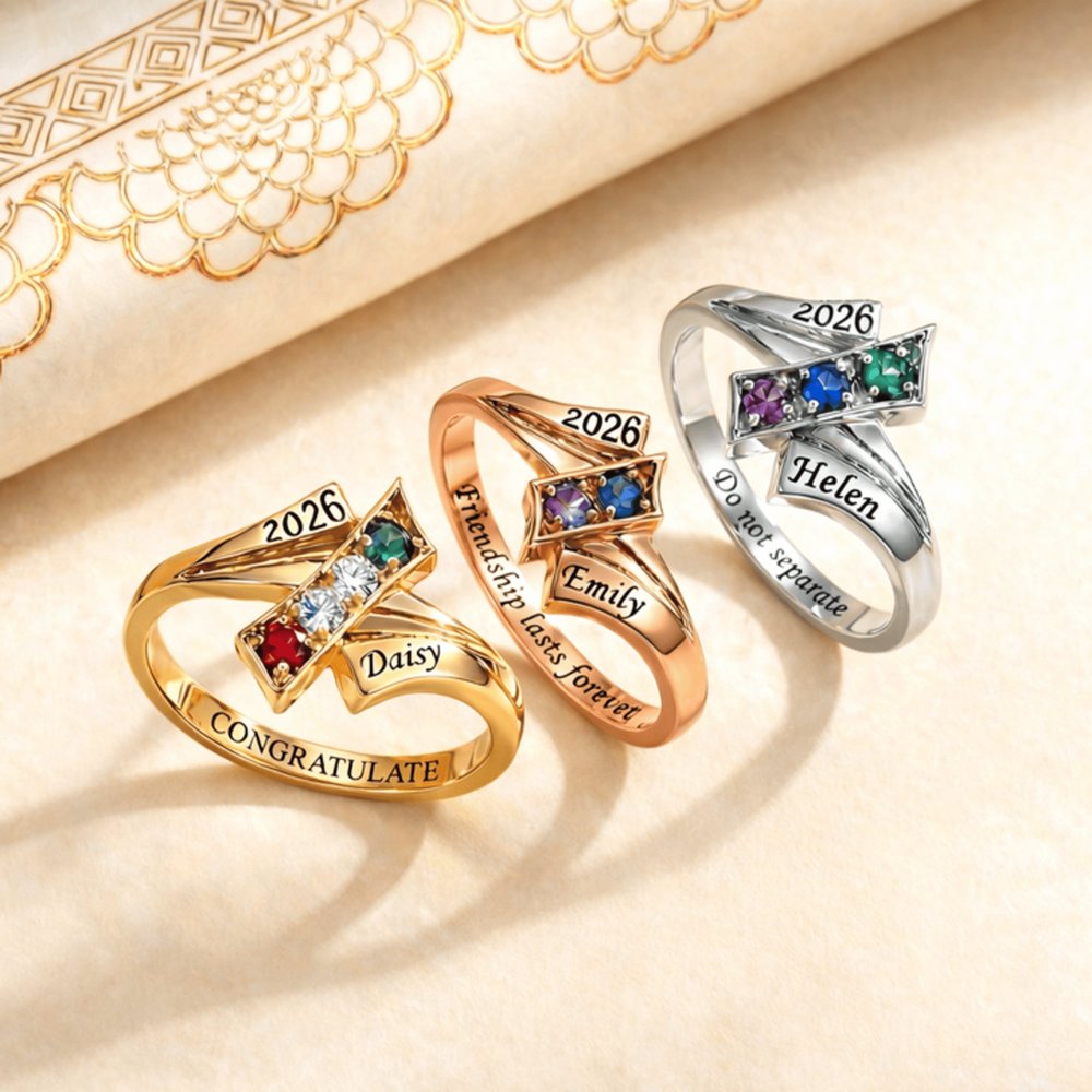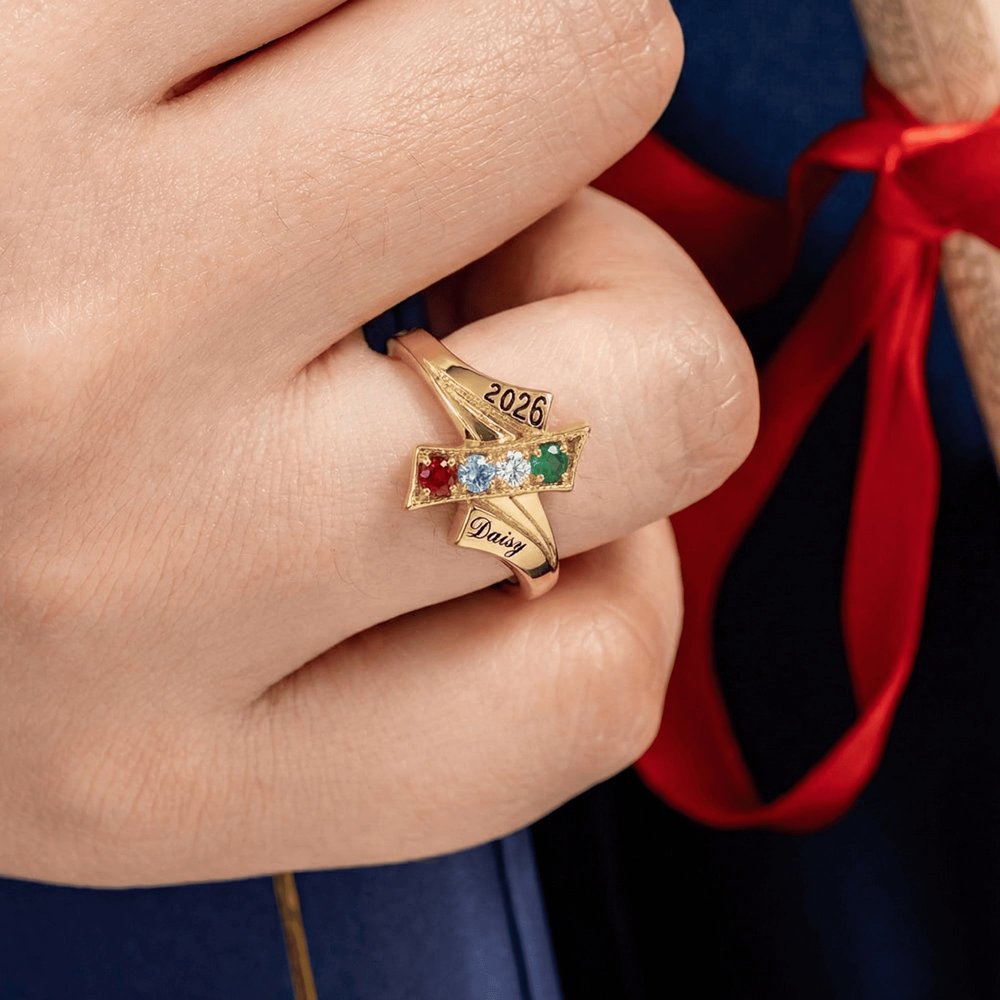 Célébrez les liens qui ont rendu l'école inoubliable avec cette bague d'amitié de fin d'études. Conçue pour honorer le lien unique entre amis, chaque bague comporte 2 à 4 pierres de naissance personnalisées - une pour chaque ami - ainsi que les noms gravés et l'année de remise des diplômes. C'est un beau symbole des souvenirs vécus et du chemin à parcourir ensemble.