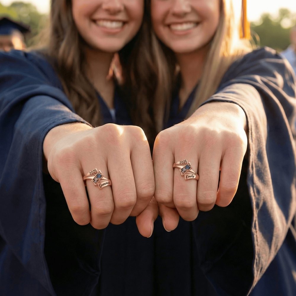 Idéal pour les meilleurs amis, les petits groupes d'amis ou les camarades de classe qui obtiennent leur diplôme ensemble. Que ce soit au lycée ou à l'université, cette bague personnalisée est une façon significative de dire "Peu importe où nous allons, nous nous porterons toujours l'un l'autre".