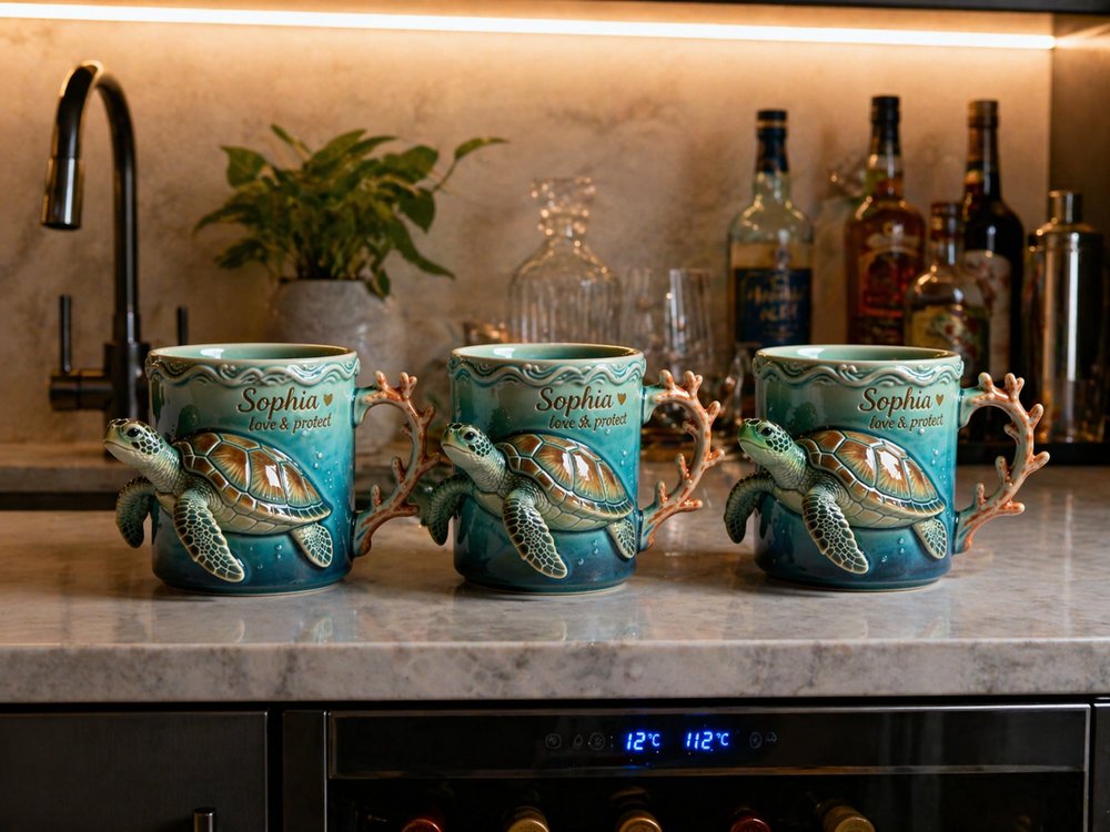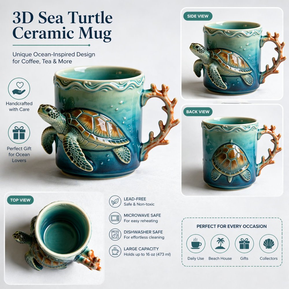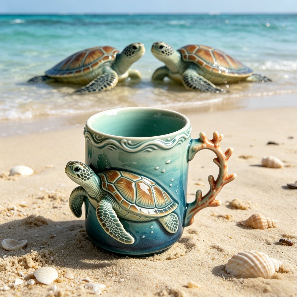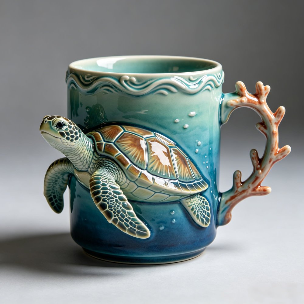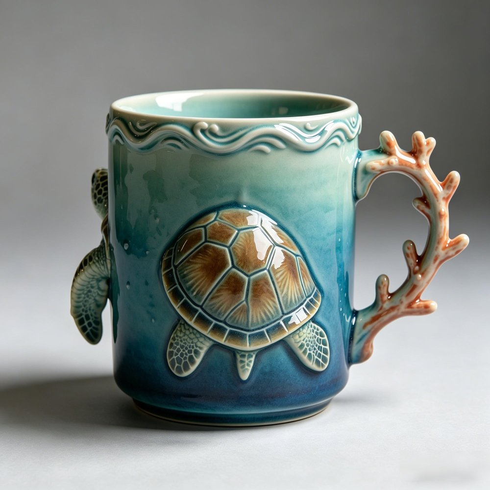 Chaque tasse est méticuleusement fabriquée avec un motif réaliste de tortue de mer en relief qui semble nager sur la surface dégradée bleu-vert de la céramique, associé à une poignée fantaisiste en forme de corail qui évoque la beauté d'un récif corallien. La finition texturée et émaillée capture la magie de l'océan, donnant à chaque gorgée l'impression d'une mini escapade côtière.