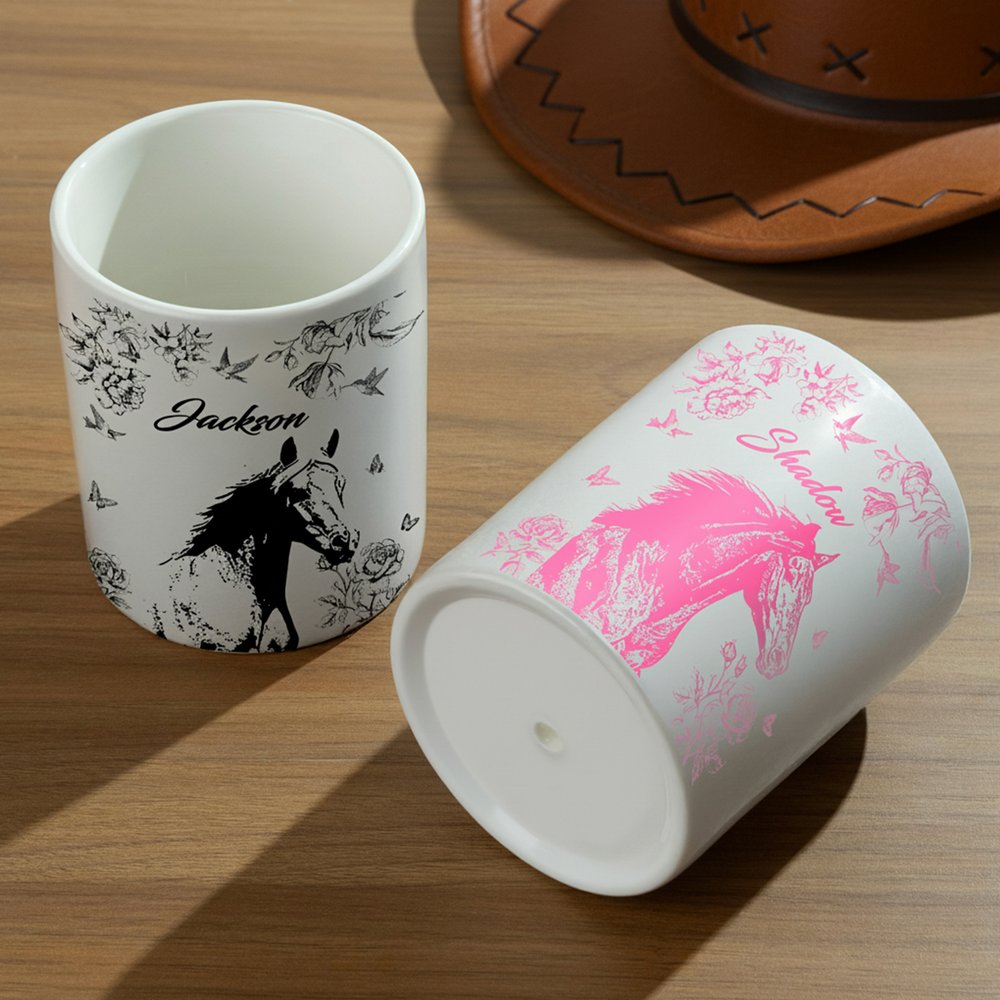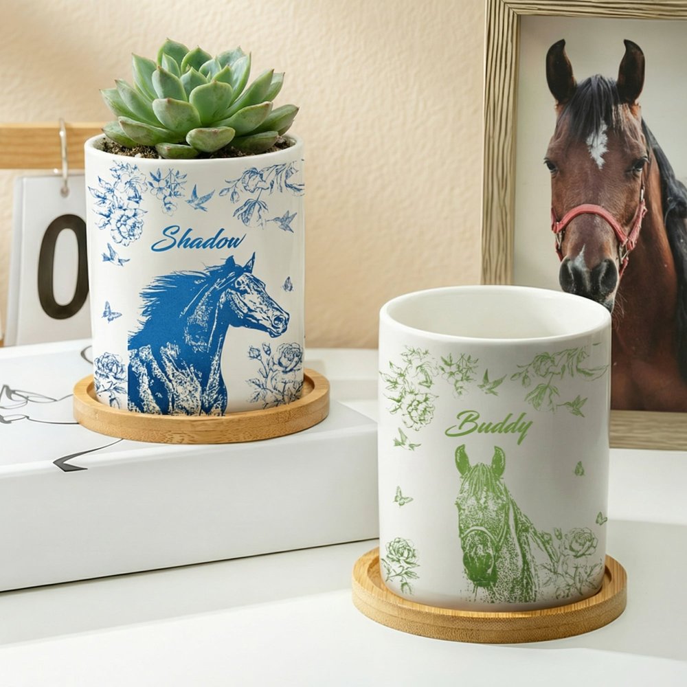 Ce pot de fleurs en céramique présente un portrait de cheval entouré de délicats motifs floraux, de colibris et de papillons. Vous pouvez personnaliser le pot de fleurs en y gravant le nom de votre cheval ou en téléchargeant une photo de votre cheval préféré, transformant ainsi un simple pot de fleurs en un souvenir unique qui commémore parfaitement le lien profond qui vous unit à votre cheval bien-aimé.