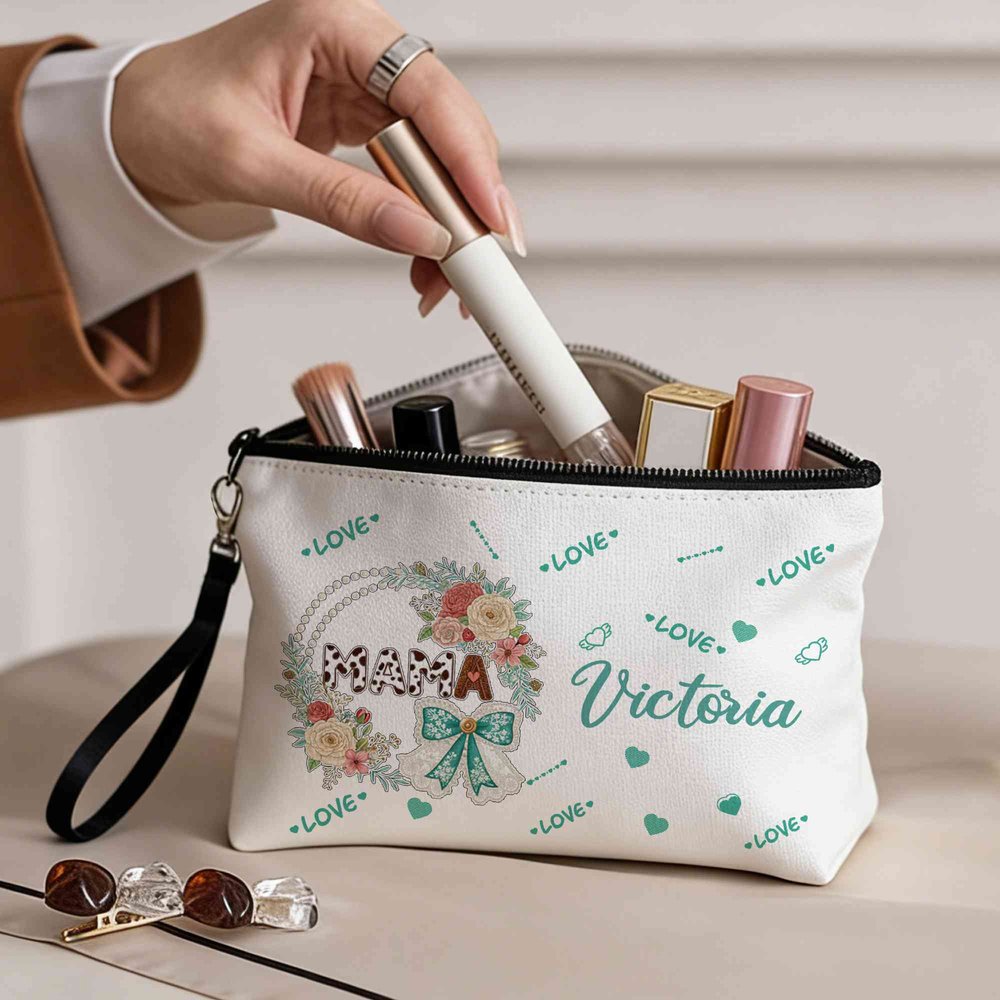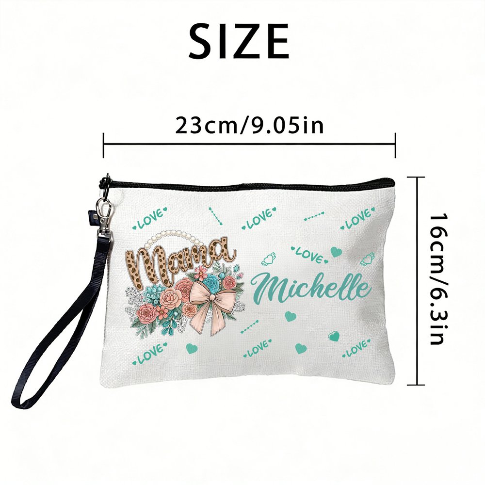 Ce set de sac à main et de trousse de maquillage personnalisé avec nœud fleuri comporte un nom personnalisé, associé à l'élégant motif floral "Mama", transformant un simple set d'accessoires en un hommage unique à son rôle de mère ou de grand-mère, alliant style féminin et fonctionnalité pratique pour créer le parfait set de cadeau pour les mères, les grands-mères et toute femme spéciale dans votre vie, idéal pour l'usage quotidien, les voyages et les cadeaux.