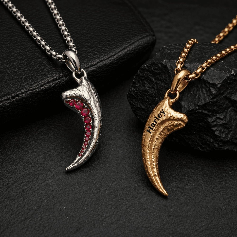 Choisissez son style, la finition du métal et la pierre de naissance pour créer un collier de crocs de loup unique en son genre. Une pièce audacieuse et intemporelle qui allie un style robuste à un sentiment personnel, parfaite pour l'homme qui porte sa force avec fierté.