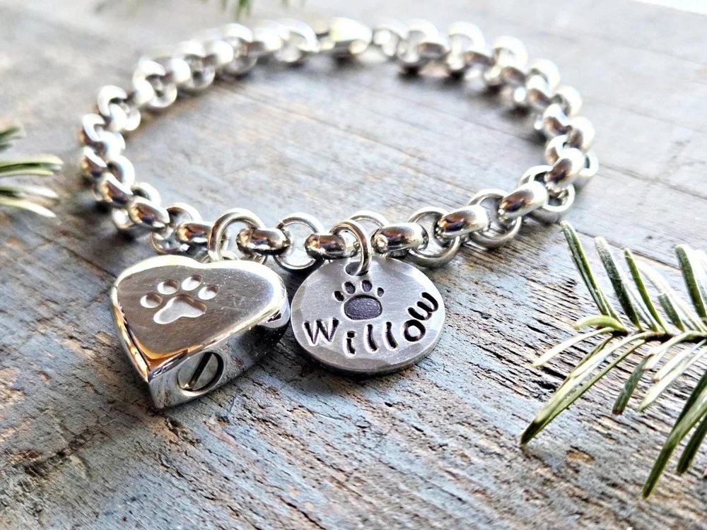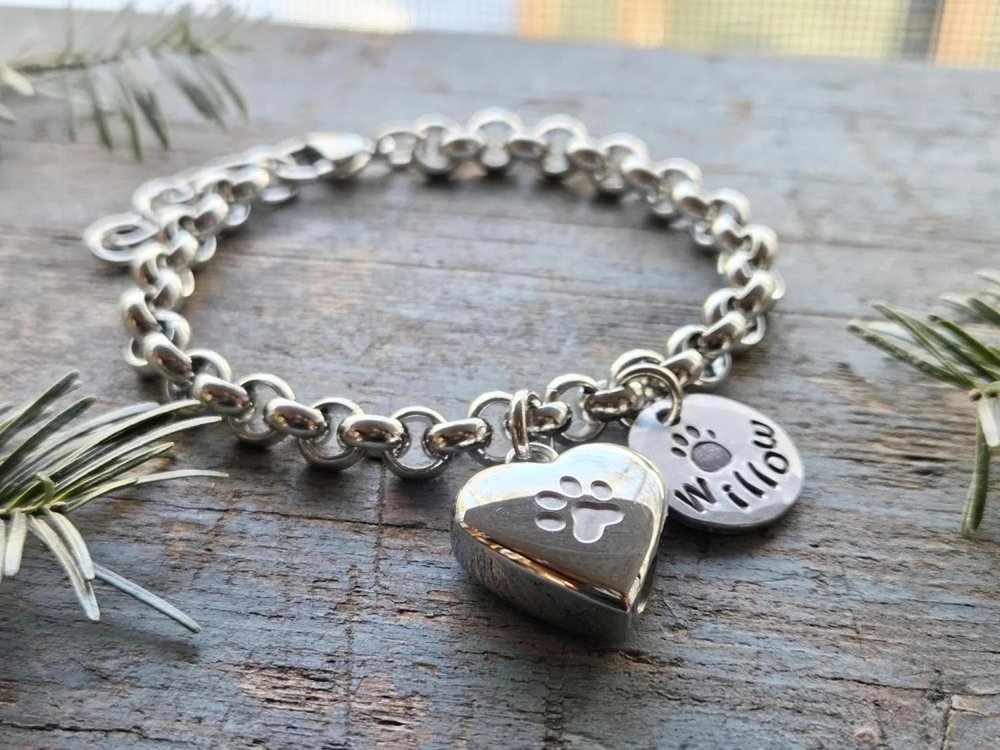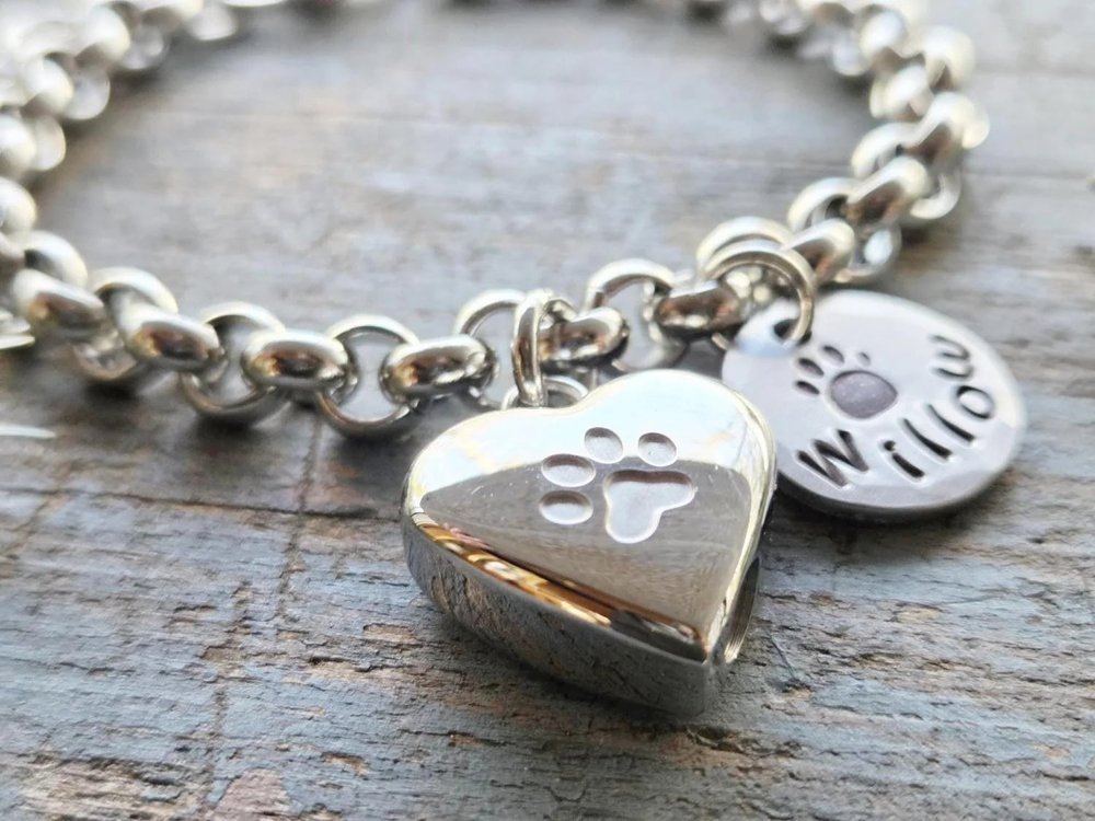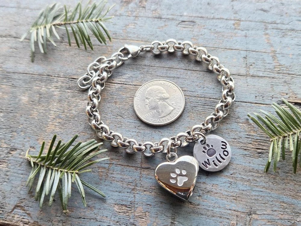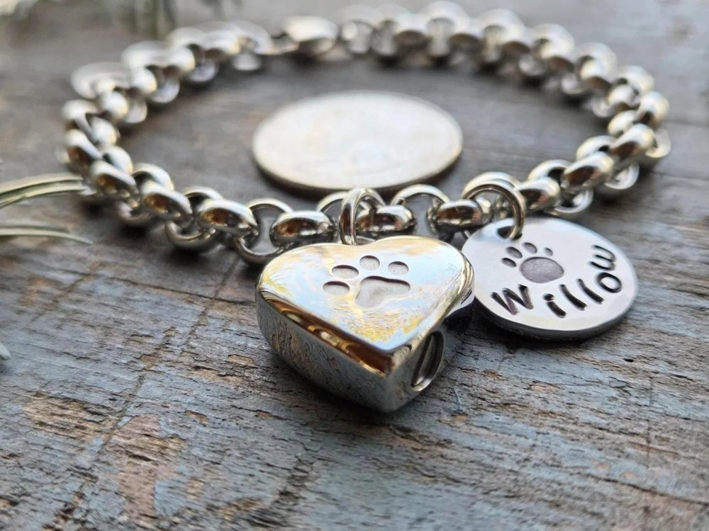 Ce bracelet personnalisé en forme d'urne de crémation pour animaux de compagnie comporte une délicate urne en acier inoxydable en forme de cœur (3/4 de pouce) associée à une breloque en forme de patte gravée à la main avec le nom de votre animal de compagnie, créant ainsi un hommage portable qui garde votre ami à fourrure bien-aimé toujours près de vous, alliant un symbolisme sincère à un style élégant et discret.