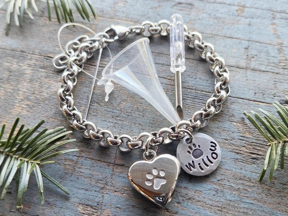 Gardez votre animal de compagnie bien-aimé toujours près de vous avec un bracelet d'urne de crémation pour animaux de compagnie personnalisé ! Personnalisez-le avec son nom dès maintenant pour créer un mémorial durable, élégant et sincère qui sera un rappel constant de l'amour et de la joie qu'il a apportés à votre vie.