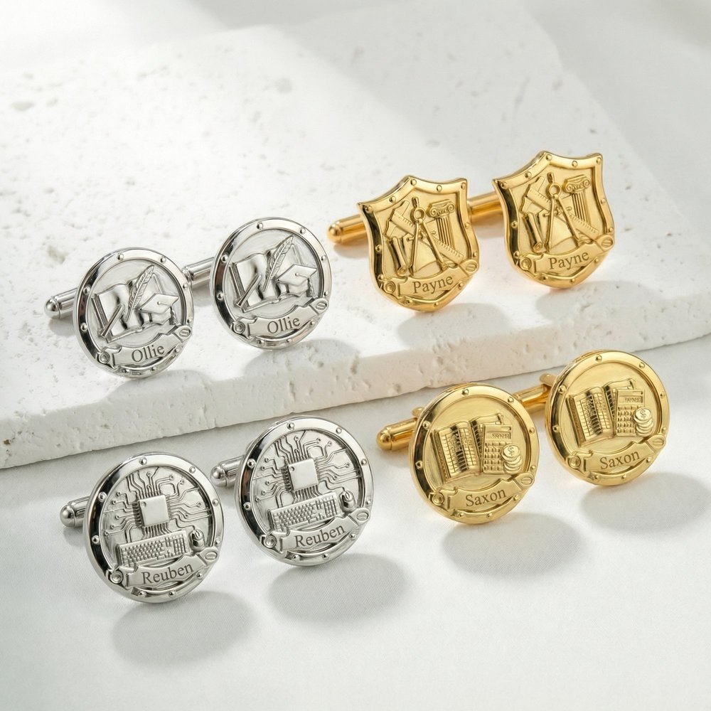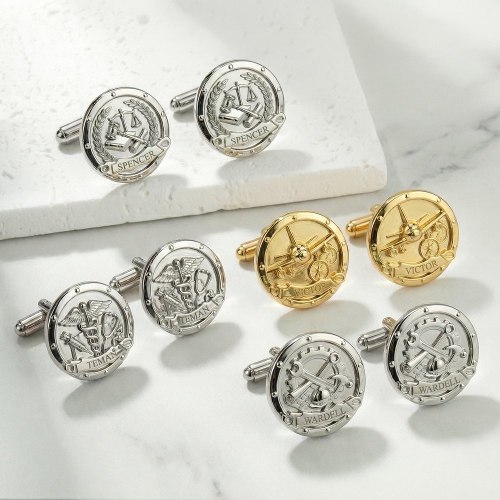 Entièrement personnalisables pour refléter votre parcours professionnel unique, vous pouvez choisir parmi 9 motifs sur le thème de la profession (médecin, pompier, policier, enseignant, etc.), sélectionner un bouclier ou une forme ronde, et graver un nom ou un court message, transformant ainsi une simple paire de boutons de manchette en un hommage unique à votre carrière, à vos réalisations et à votre identité professionnelle, idéal pour célébrer des étapes importantes telles que l'obtention d'un diplôme, d'une promotion ou d'une retraite.