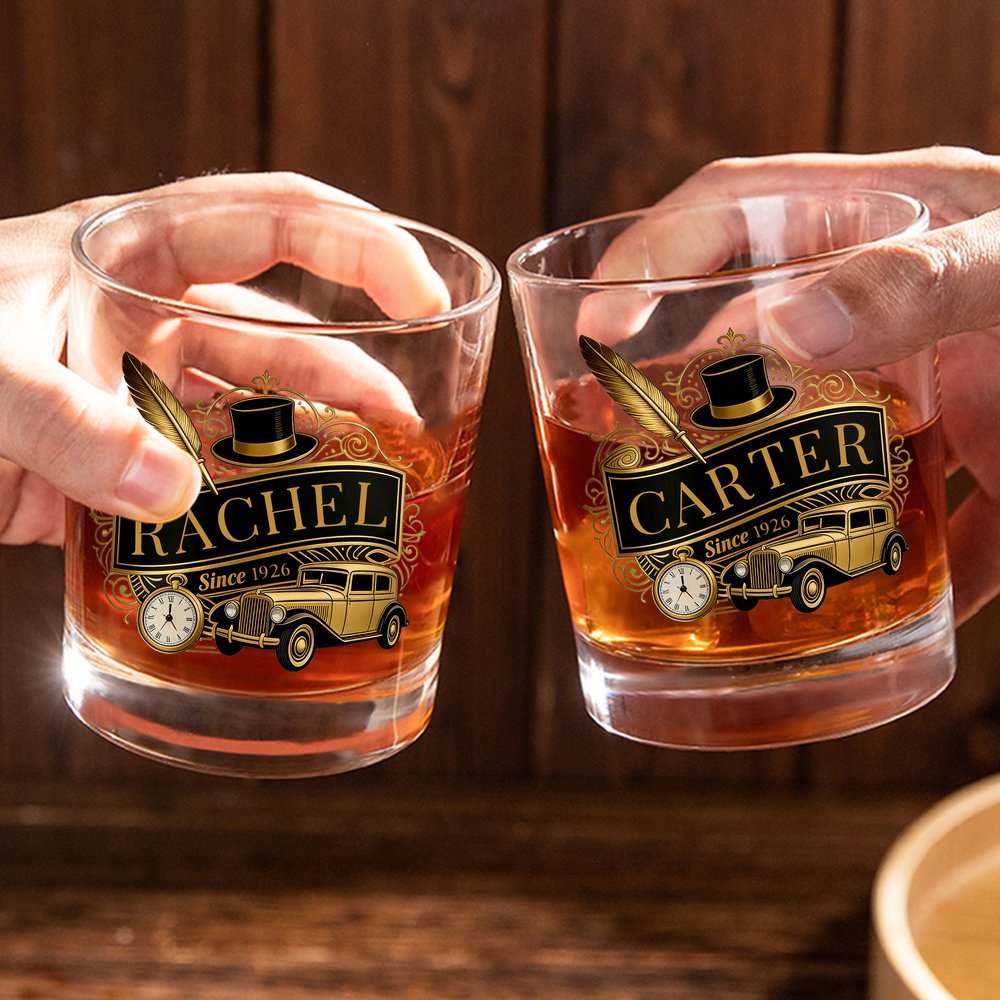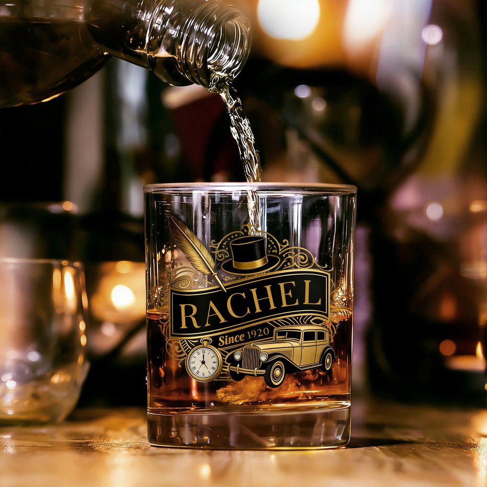 Remontez le temps avec un verre à whisky inspiré de l'élégance de l'âge d'or. Avec ses motifs déco vintage, sa typographie classique et son nom personnalisé, ce verre évoque la sophistication d'une époque révolue. Il est parfait pour l'homme qui apprécie un style intemporel et un bon verre.
