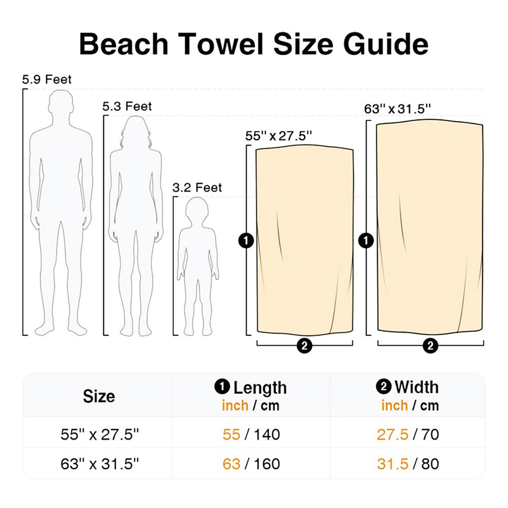 | Mesure: | Serviette de plage - 70cm × 140cm(27.5" × 55"), 80cm × 160cm(31.5" × 63"), Sac - 40cm × 37cm(15.75" × 14.57") |