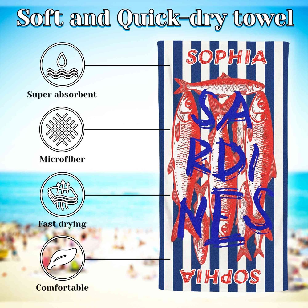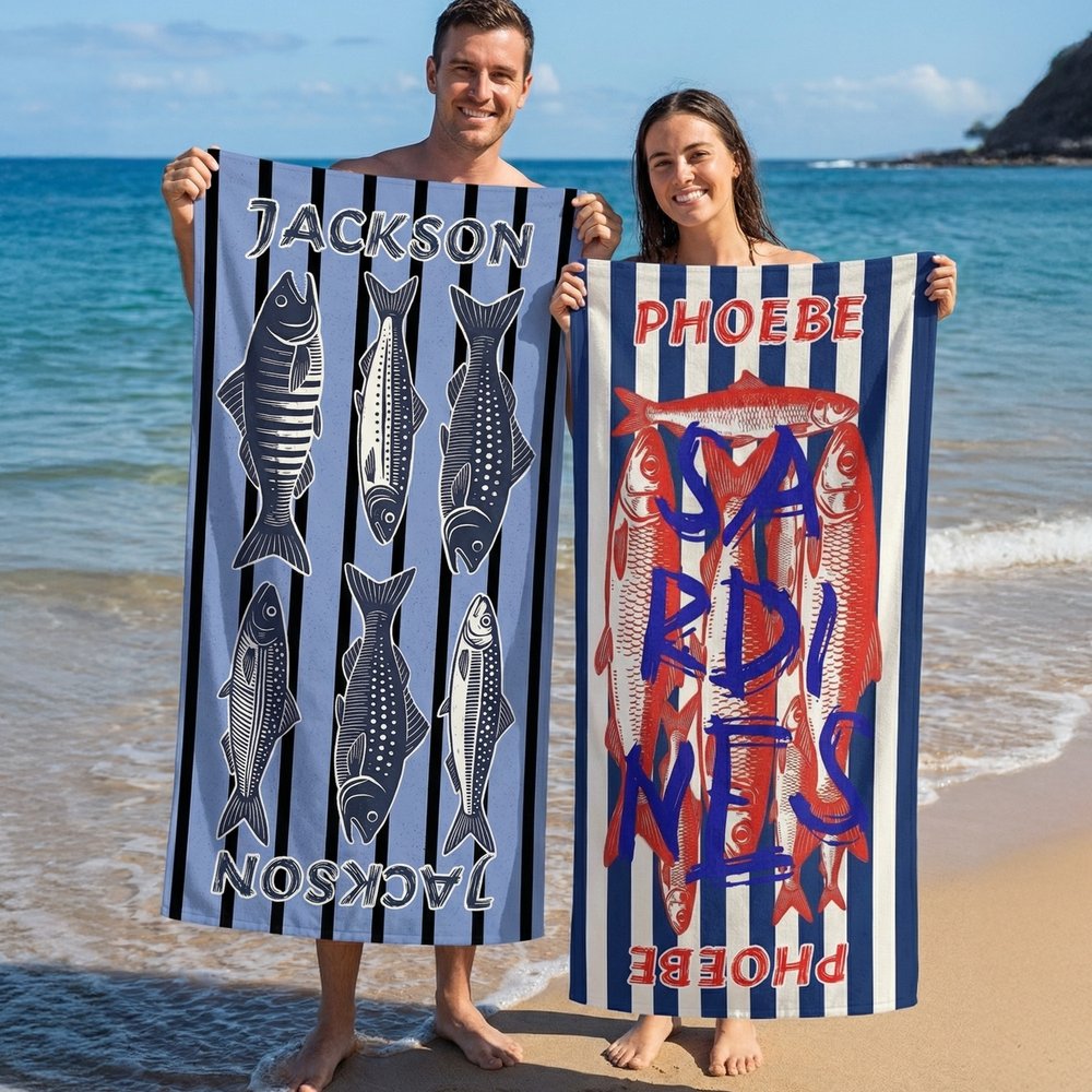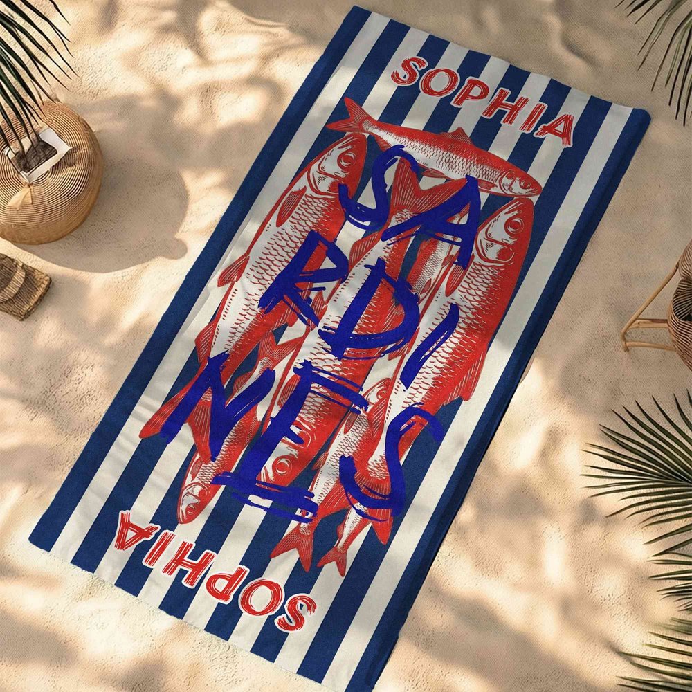 Célébrez le charme excentrique de la vie de pêcheur avec un motif ludique de sardines ou de poissons plats ! Chaque serviette présente des illustrations fantaisistes de ces créatures marines bien-aimées, astucieusement tissées dans un design amusant, prêt pour la plage. Le nom personnalisé est mis en évidence, faisant de cet ensemble un compagnon unique pour tout amateur de pêche. Qu'il soit destiné à un pêcheur chevronné ou à un jeune fan de pêche, cet ensemble suscite la joie et l'amour de l'océan à chaque utilisation.