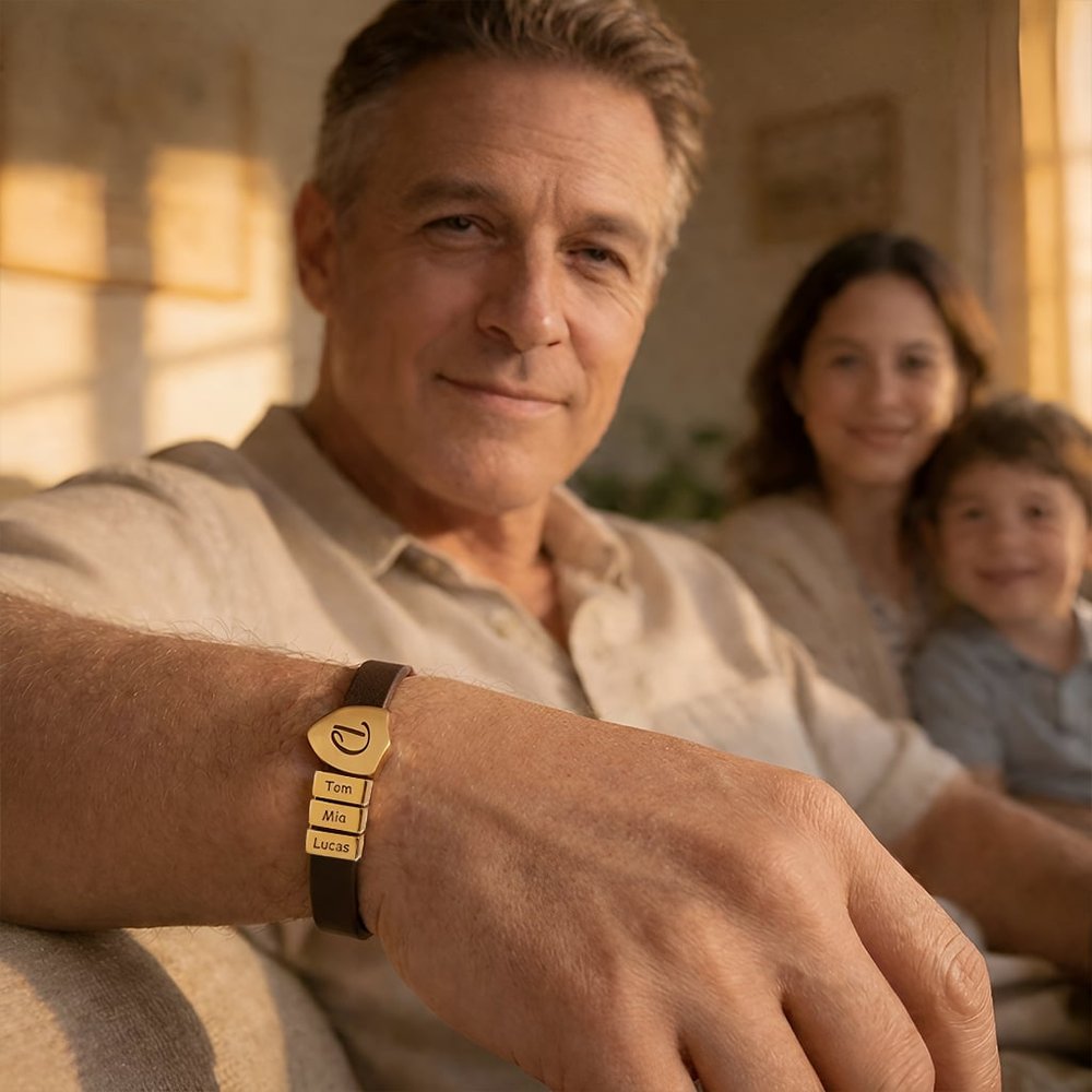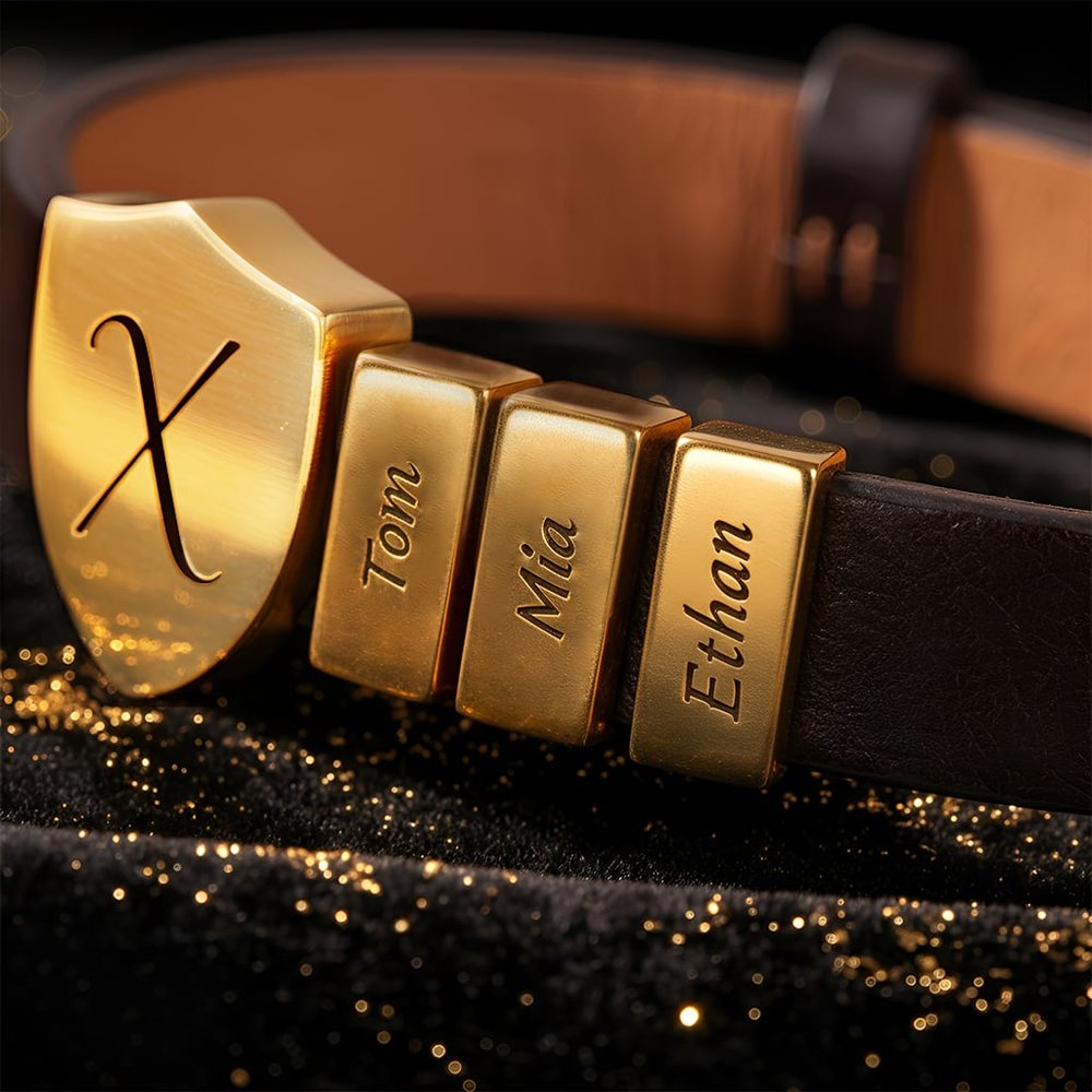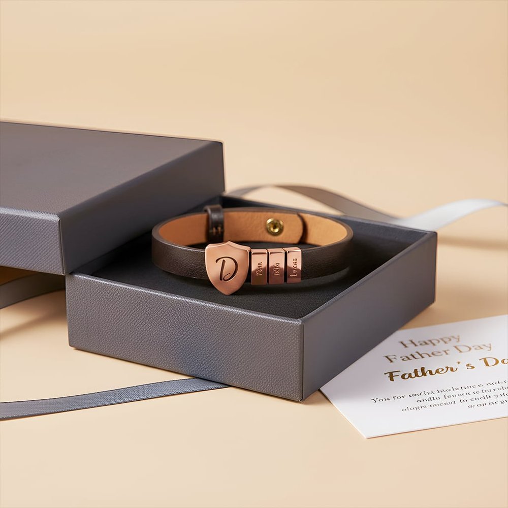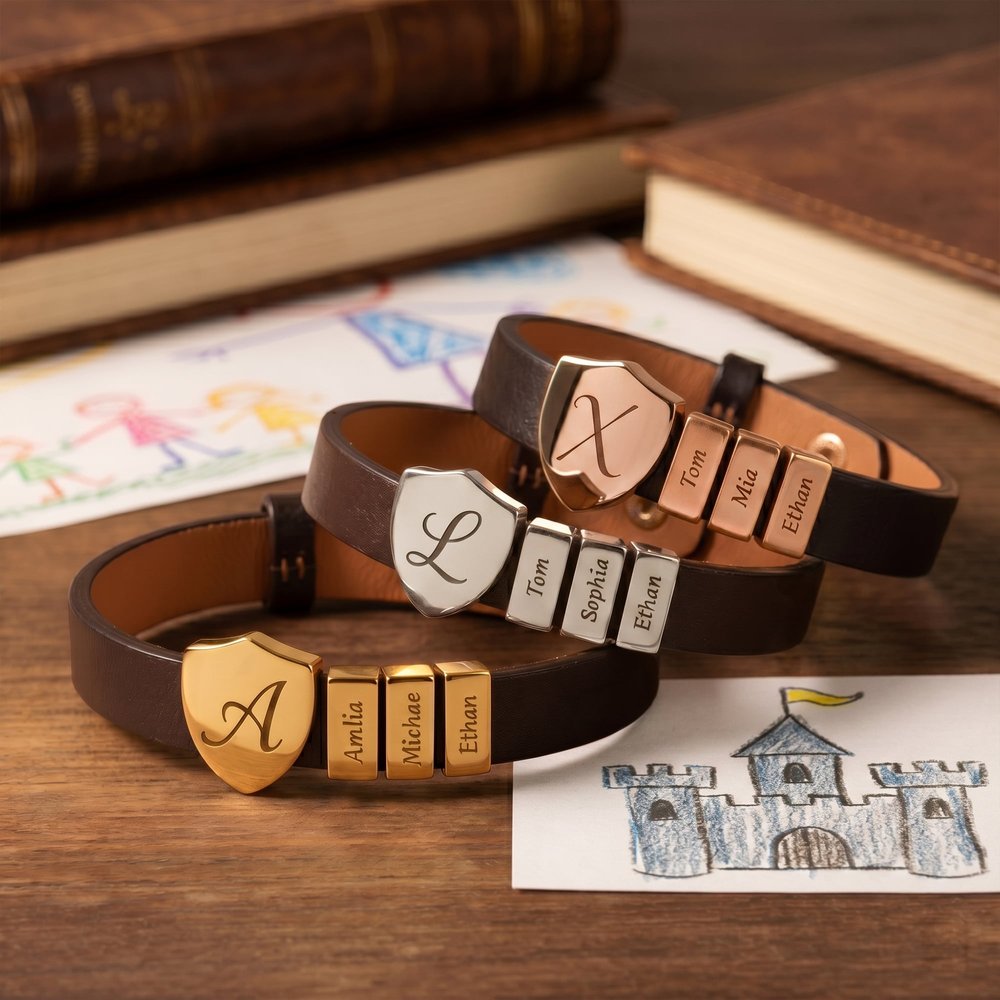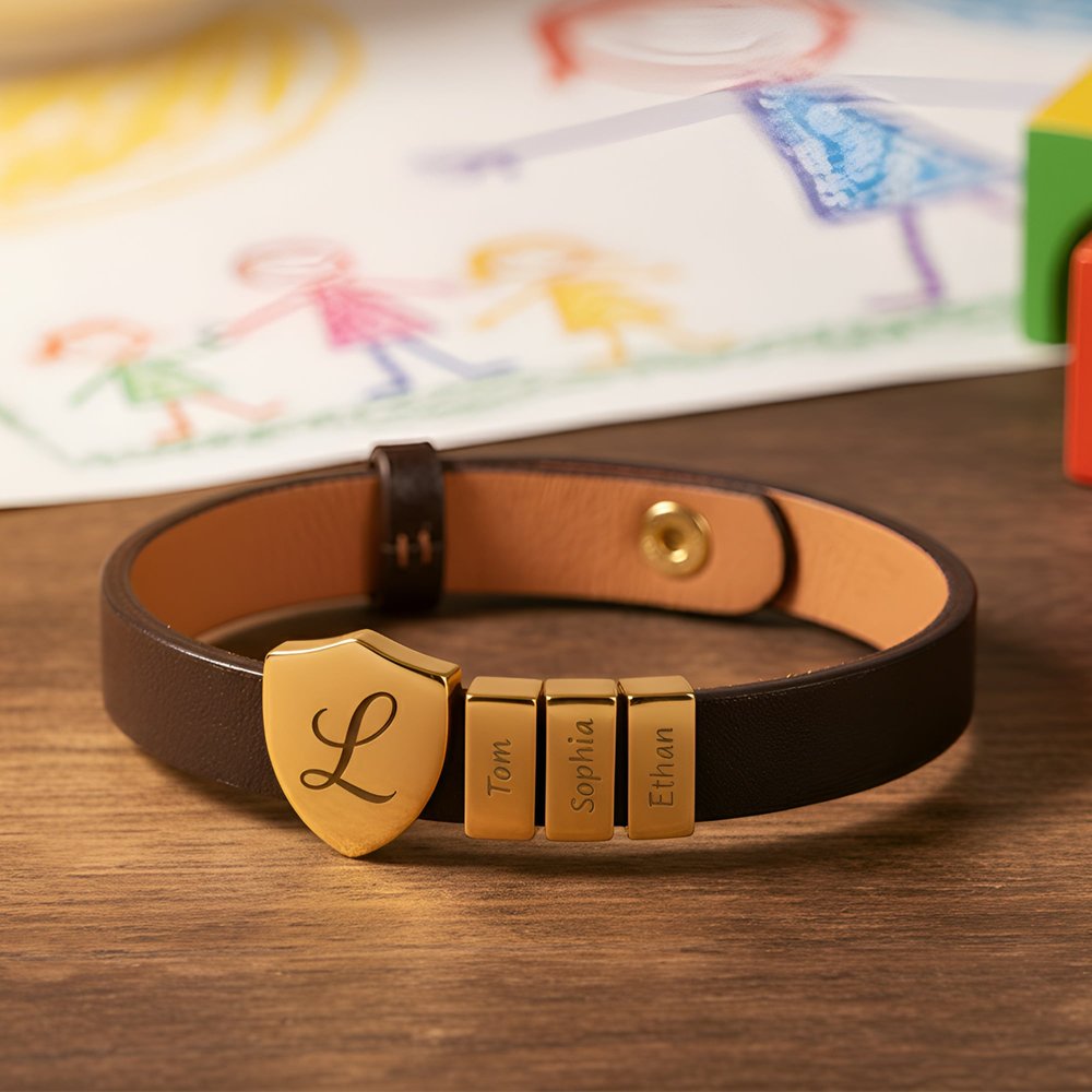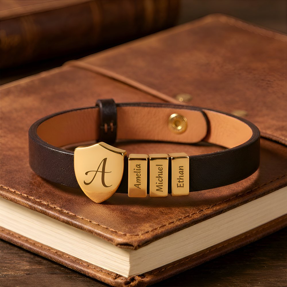 Célébrez le père qui protège et dirige avec ce bracelet en cuir bouclier personnalisé pour papa. Doté d'une breloque bouclier gravée avec les initiales et les noms des enfants sur le côté ou sur l'accessoire droit, ce bracelet est un puissant symbole de force, d'identité et d'amour paternel. C'est un rappel quotidien que sa famille est toujours avec lui - où qu'il aille.