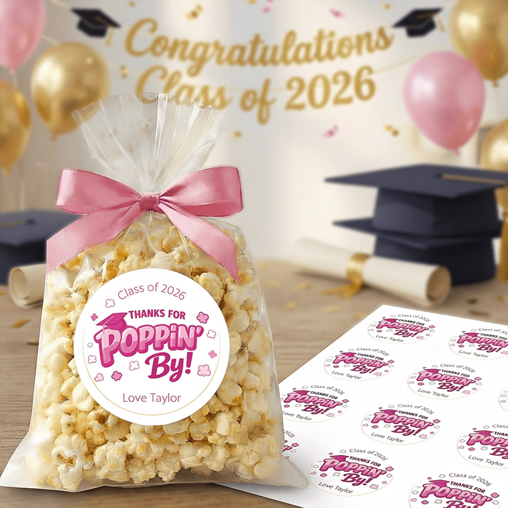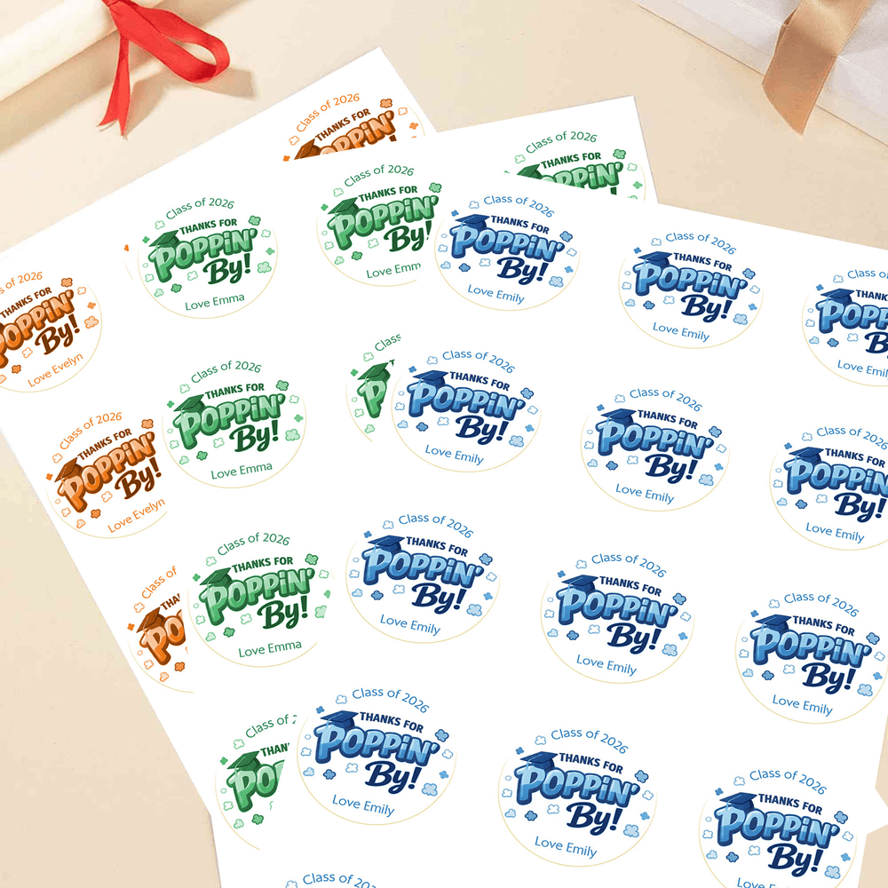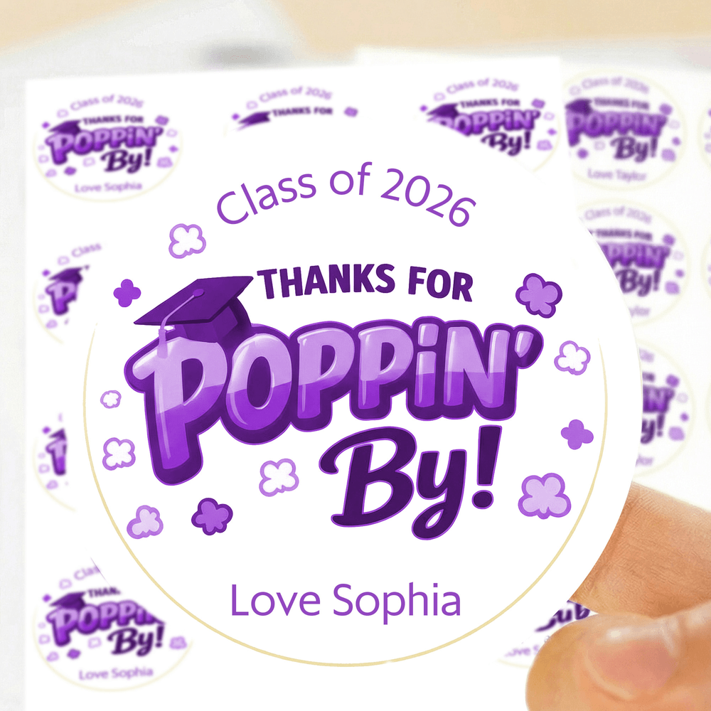 Doté d'un charmant message "Thank You for Poppin By", cet autocollant est magnifiquement conçu pour capturer l'esprit joyeux de la saison des remises de diplômes. Disponible dans une variété de couleurs et de styles, il peut être personnalisé avec l'année et le nom du diplômé, faisant de chaque autocollant un souvenir unique de la remise des diplômes. Il préserve magnifiquement cette étape spéciale tout en exprimant les félicitations les plus sincères et les meilleurs vœux pour l'avenir du diplômé.