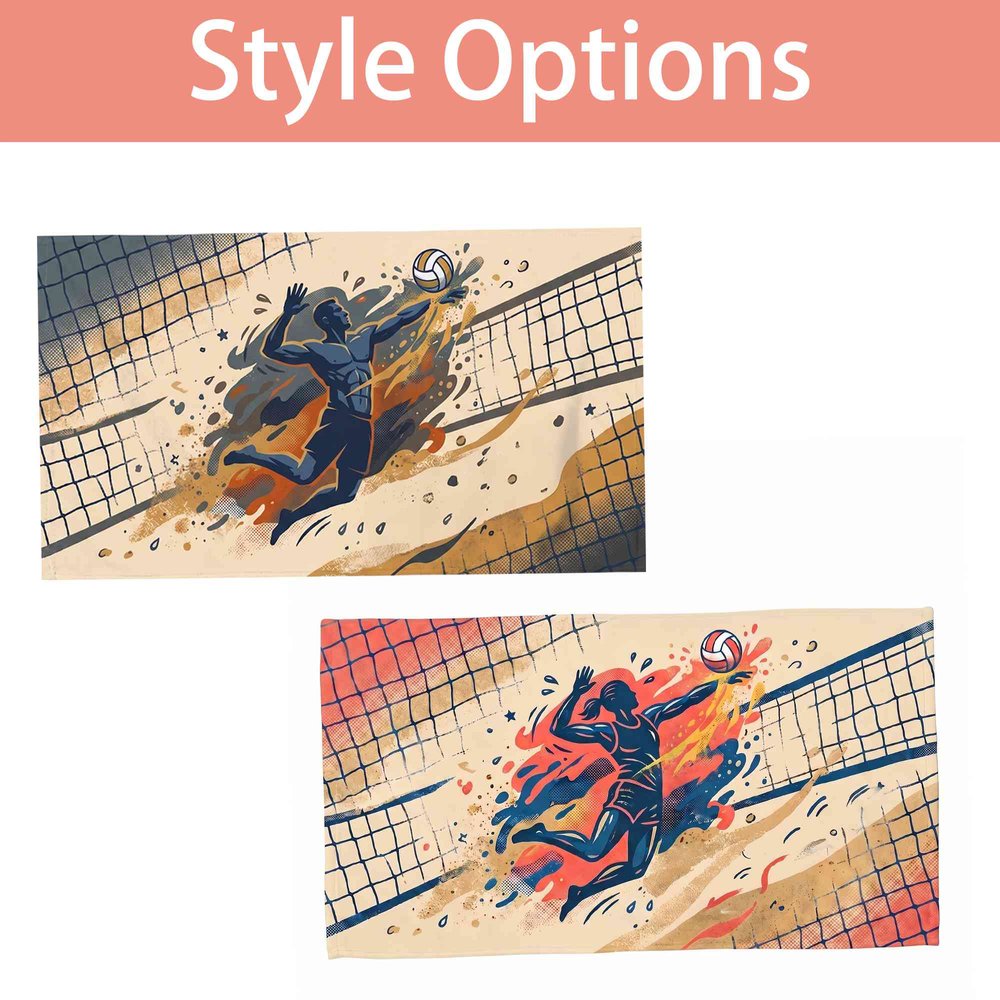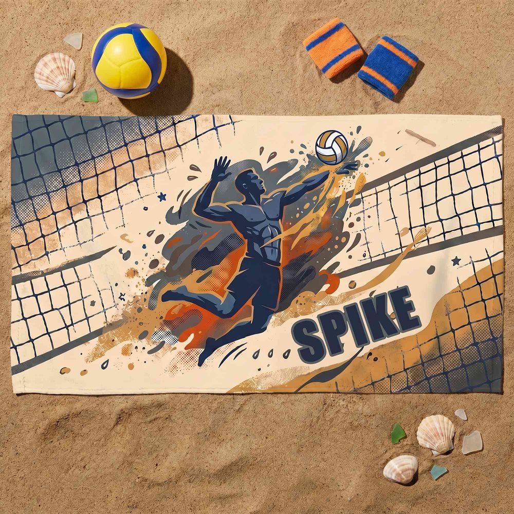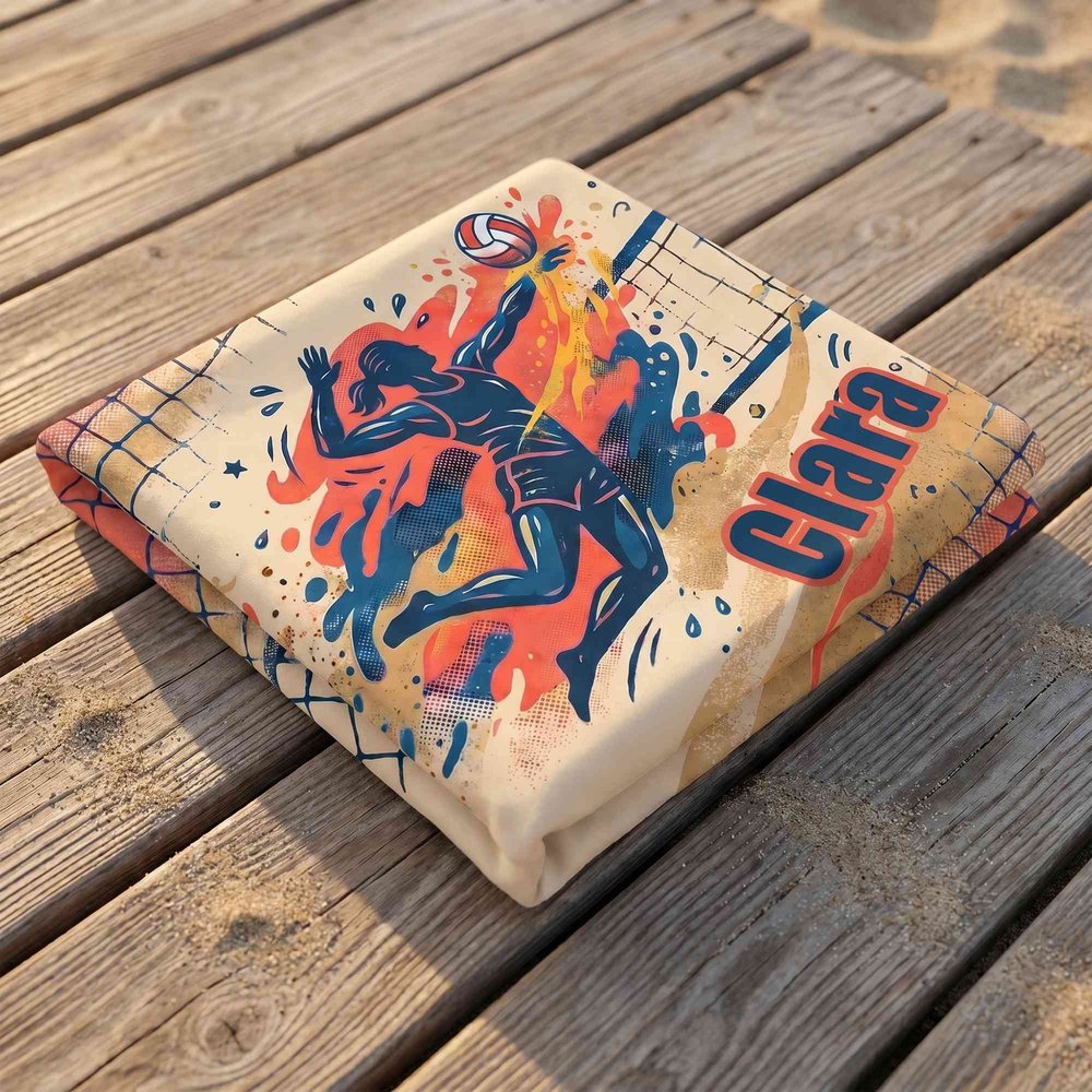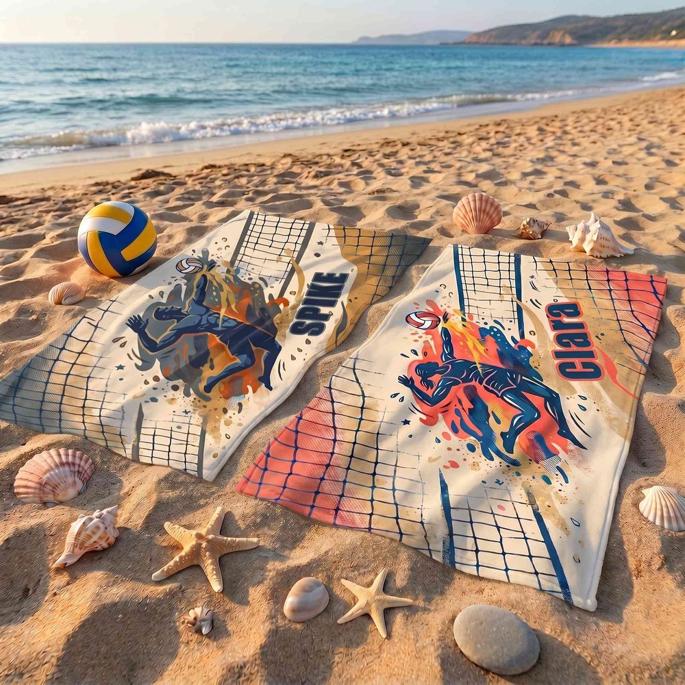 Choisissez parmi deux motifs sportifs et vibrants inspirés par l'énergie du volley-ball de plage. Chaque serviette présente une impression rétro frappante d'un joueur frappant le ballon contre un filet, accentuée par des éclats de couleur qui se détachent sur le fond doux et neutre. Ajoutez un nom personnalisé sur la serviette, créant ainsi une pièce unique qui montre l'esprit d'équipe ou célèbre l'amour d'un joueur pour le jeu.