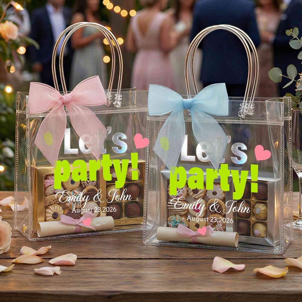 Fabriqués de manière experte en PVC transparent de haute qualité, ces sacs cadeaux sont dotés de poignées renforcées et lisses et d'une construction robuste qui est faite pour durer. L'impression irisée et accrocheuse du slogan, des noms des mariés, de la date du mariage et des charmants motifs du mariage reste vibrante et belle, tandis que le matériau PVC durable protège vos cadeaux et vos faveurs. Les sacs sont réutilisables, ce qui en fait un souvenir durable et attentionné longtemps après la célébration.