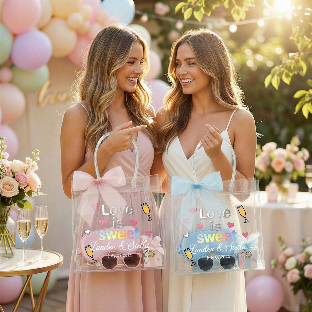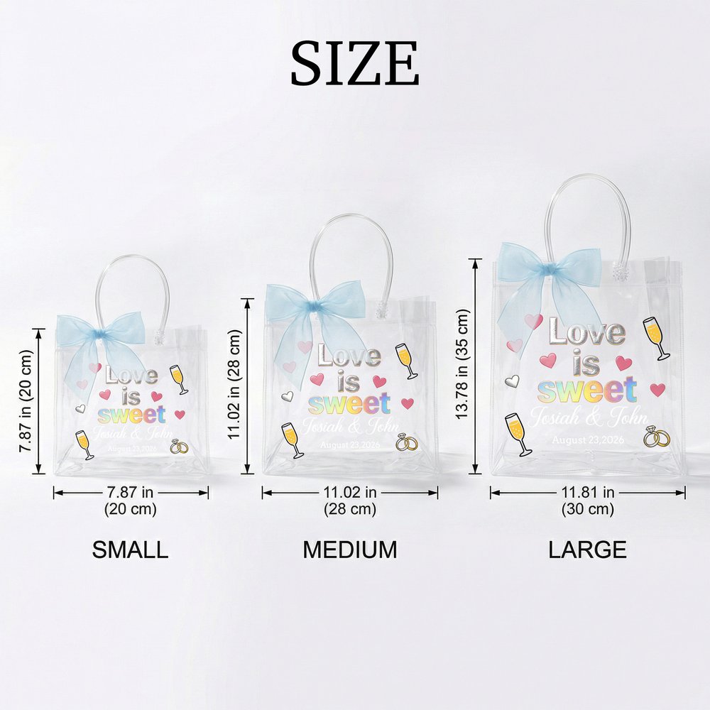 Entièrement personnalisé pour correspondre au thème de votre mariage et à votre histoire d'amour, vous pouvez personnaliser chaque détail : ajoutez les noms et prénoms des mariés, la date de votre mariage, choisissez la couleur du ruban de satin et modifiez même le slogan pour créer un sac unique en son genre. Cette touche personnalisée transforme chaque fourre-tout transparent en un souvenir significatif et exclusif qui célèbre votre nouveau parcours ensemble.