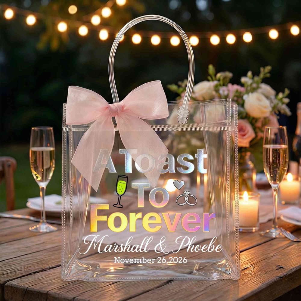 Rehaussez votre mariage ou votre fête nuptiale avec des sacs cadeaux personnalisés "A Toast To Forever" ! Personnalisez dès maintenant vos noms, la date et la couleur du nœud pour créer un souvenir élégant et romantique qui ajoutera de la magie à votre journée spéciale.